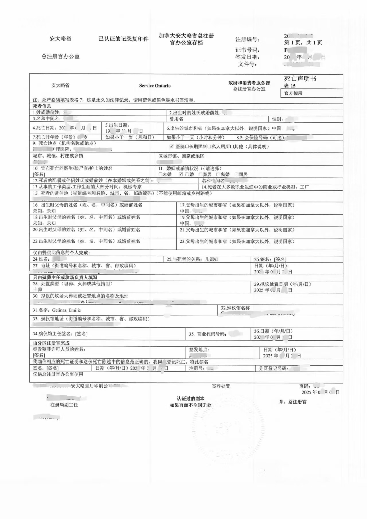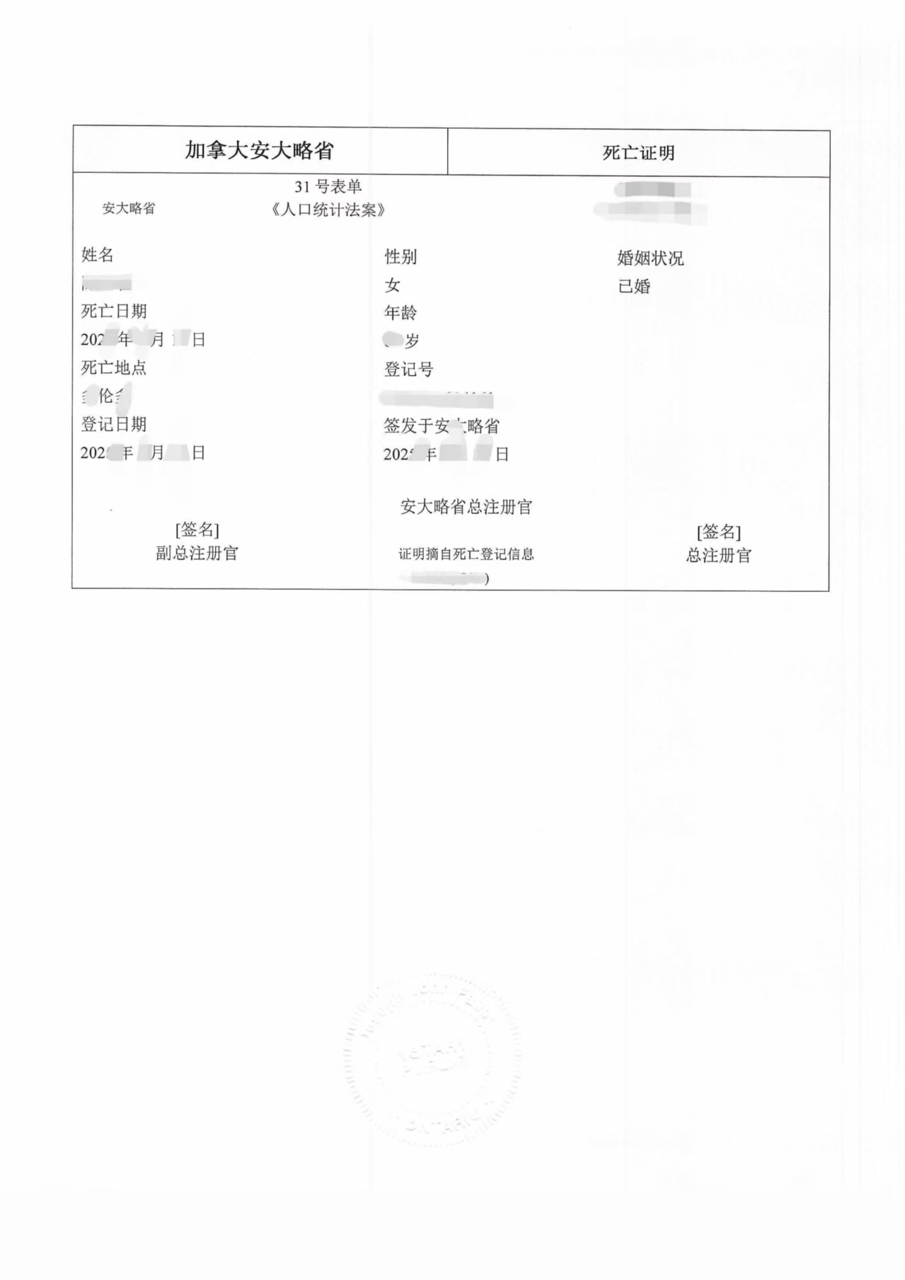 注意:以下案例用的都是化名,保护个人隐私信息。2025年初,加拿大安大略省密西沙加市的居民陈慧仪女士委托其家属在中国办理父亲遗产继承及银行账户销户手续。其父亲陈德安于2025年2月14日在多伦多逝世,家属需在国内完成与死亡相关的继承公证和财产清理。为确保在中国使用的文件具有法律效力,陈慧仪委托本事务所办理其父亲死亡证明的海牙认证(Apostille)。