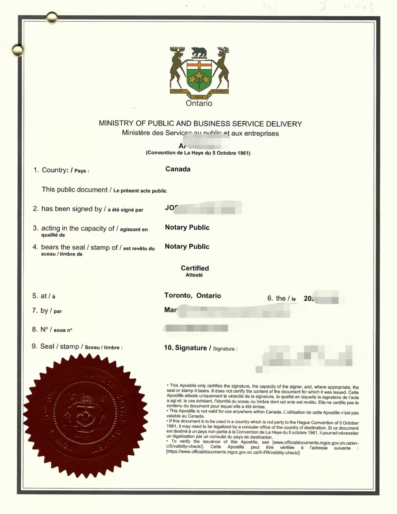 为使声明在中国具有法律效力,该文件须在加拿大完成海牙认证(Apostille)。刘泽林首先前往当地的公证员(Notary Public)处签署声明书,由公证员核实身份、见证签字并出具公证证明。随后,文件递交至所属省政府认证机构或加拿大外交部(Global Affairs Canada),对公证员身份及印章进行核验,并附上Apostille认证页。