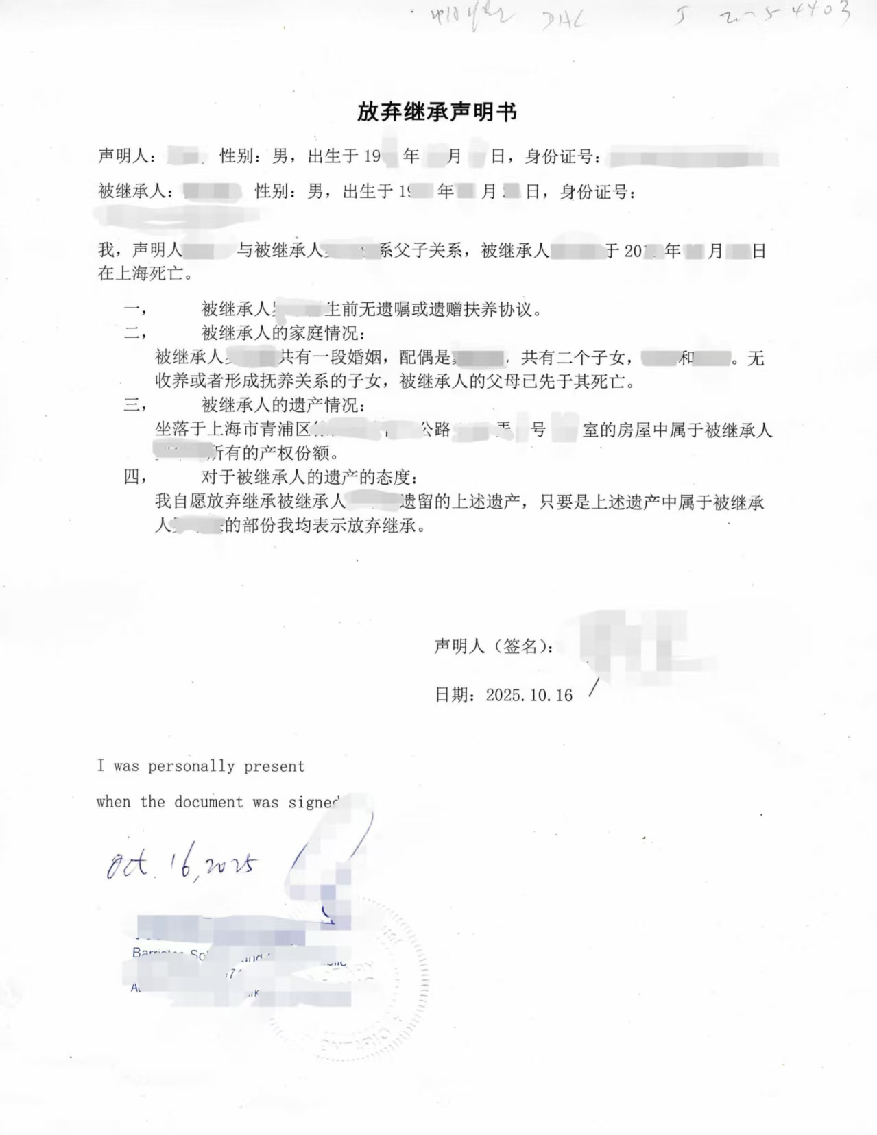 由于刘泽林长期定居加拿大,并无意继承父亲在中国的房产,为配合家属办理遗产继承及过户手续,他决定出具正式的放弃继承声明书。声明书中,刘泽林明确表示:自愿放弃对父亲遗留在上海的不动产部分的全部继承权;声明内容真实、明确且不可撤销,并确认已充分理解其法律后果。