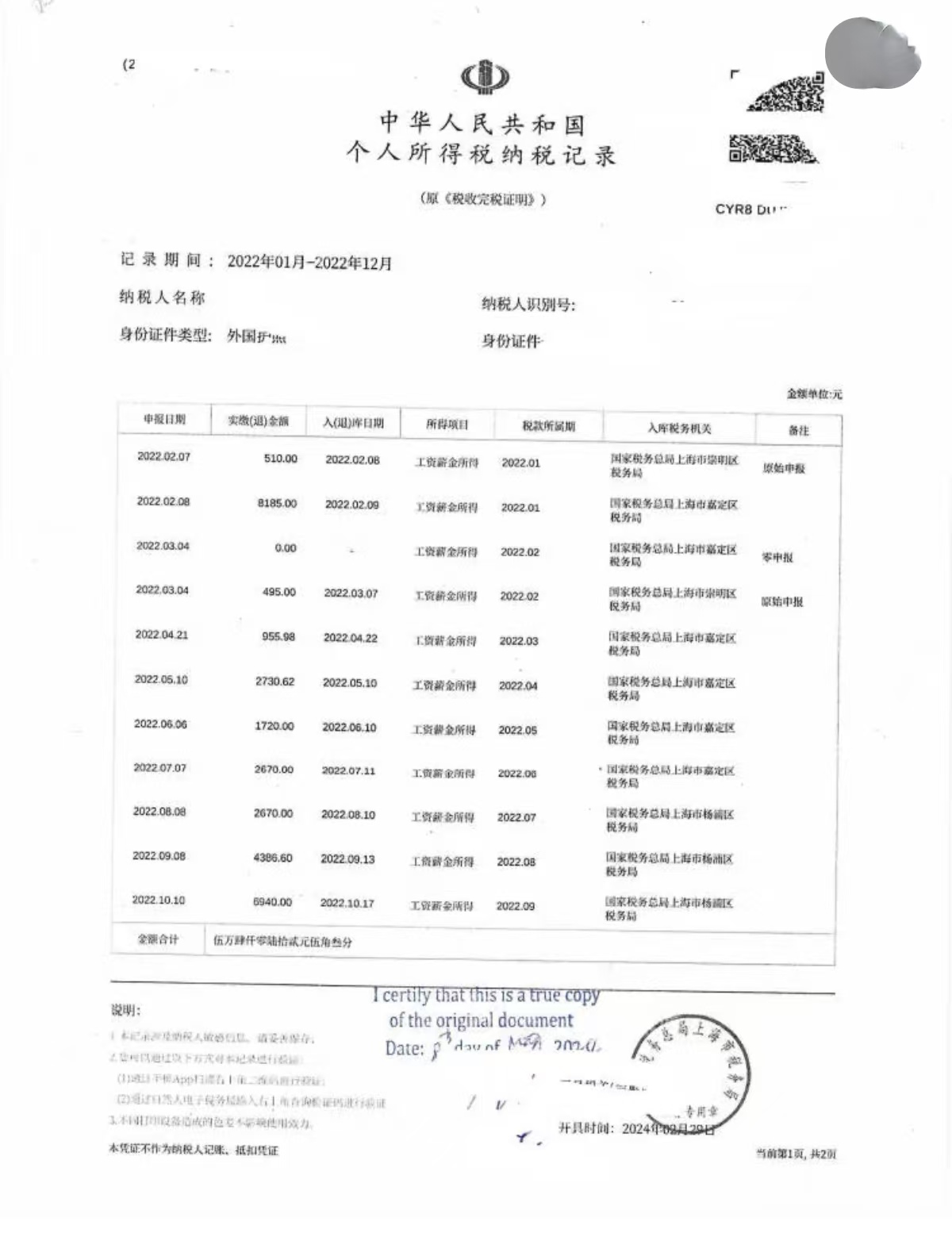 中国工资收入纳税记录加拿大中英文翻译认证