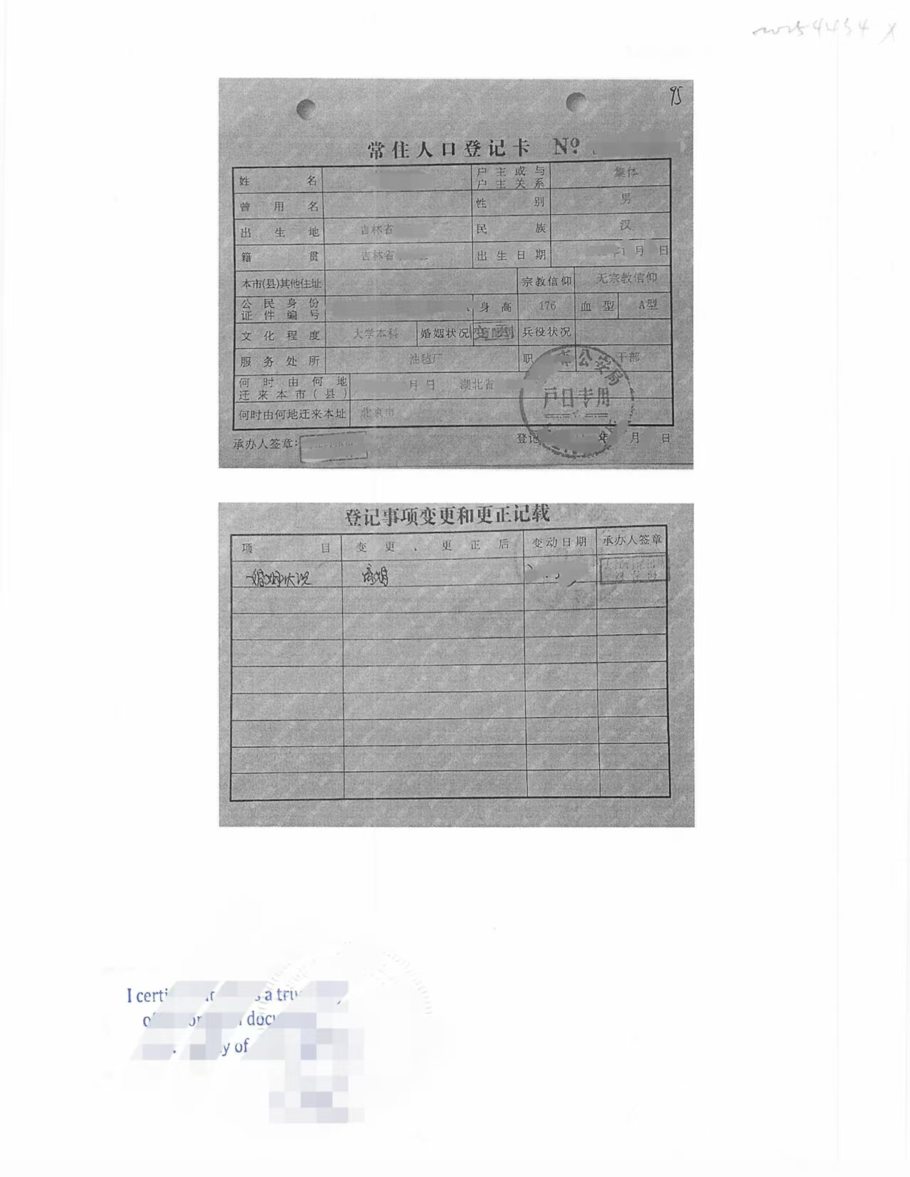 该份经翻译及公证的户口卡被作为证明申请人家庭成员关系、婚姻真实性的重要辅助文件之一,成功通过审核。此案例表明,中国公民在加拿大办理户口卡翻译公证完全可行,且如符合翻译资质与认证标准,可在当天完成并被加拿大官方机构认可。