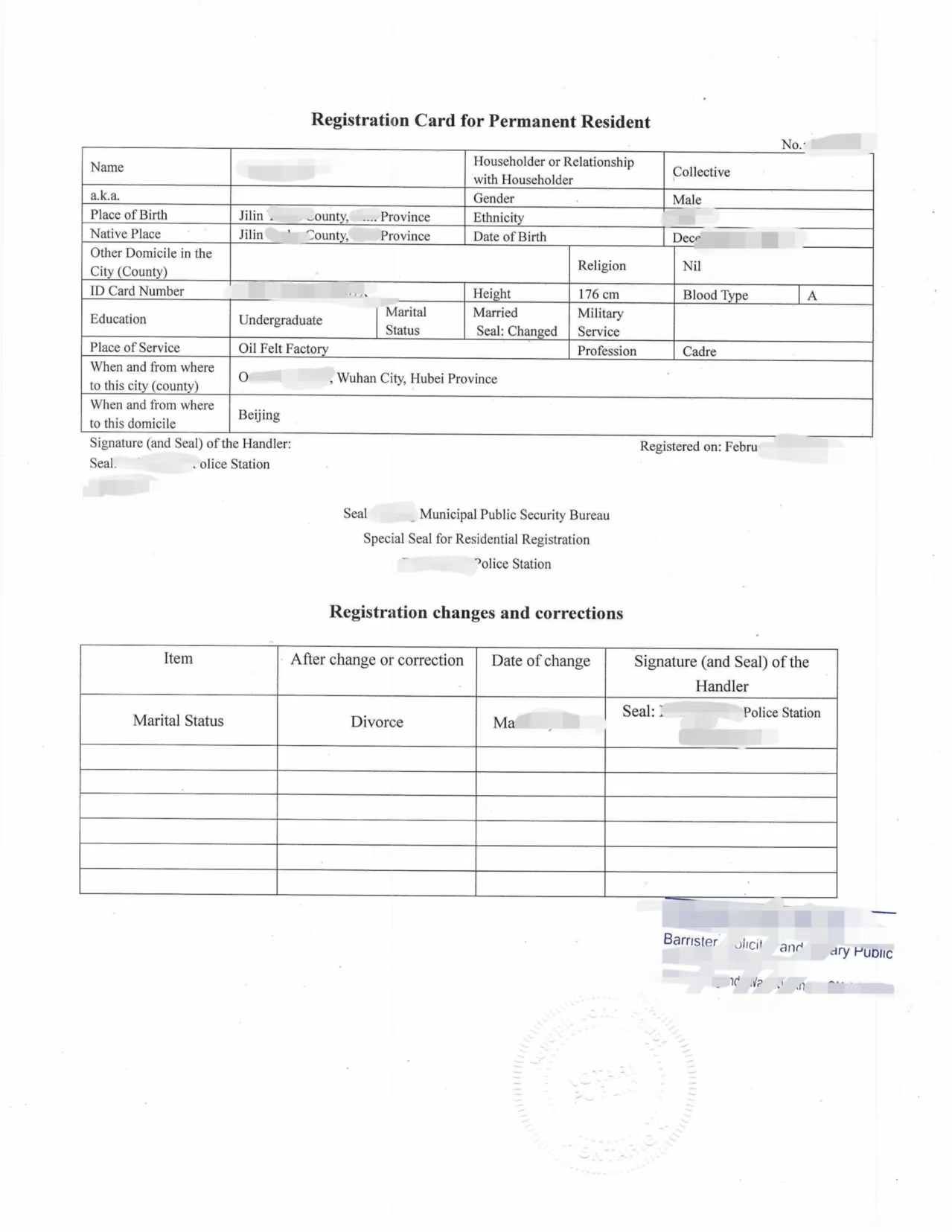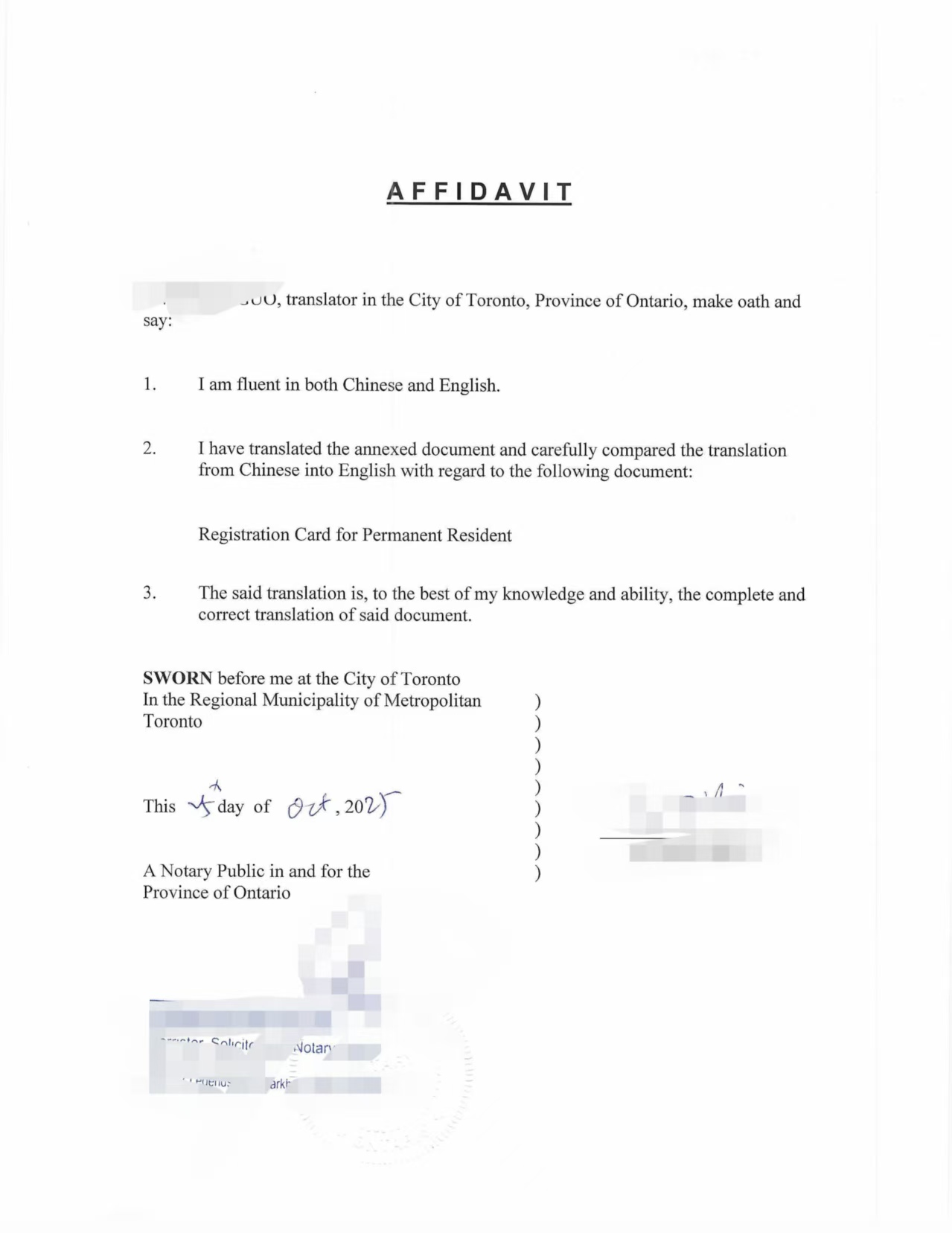 由于该文件为中文,王女士需要在加拿大进行英文翻译并公证。她委托当地具有资质的认证翻译员(Certified Translator)将整份“常住人口登记卡”翻译为英文,准确包括姓名、性别、出生日期、籍贯、住址、婚姻状况、与户主关系等内容。译文完成后,由翻译员出具**翻译声明(Affidavit of Translation Accuracy)并在加拿大公证员(Notary Public)**处签署公证,以证明译文与原件内容一致、准确无误。