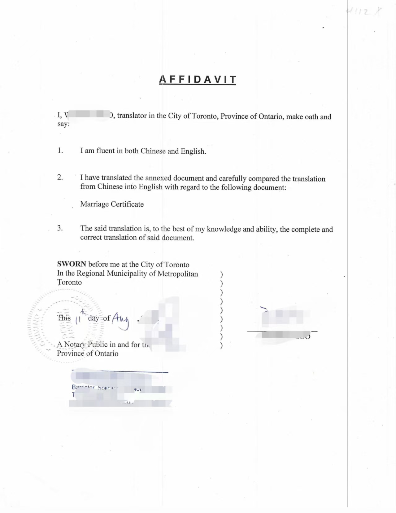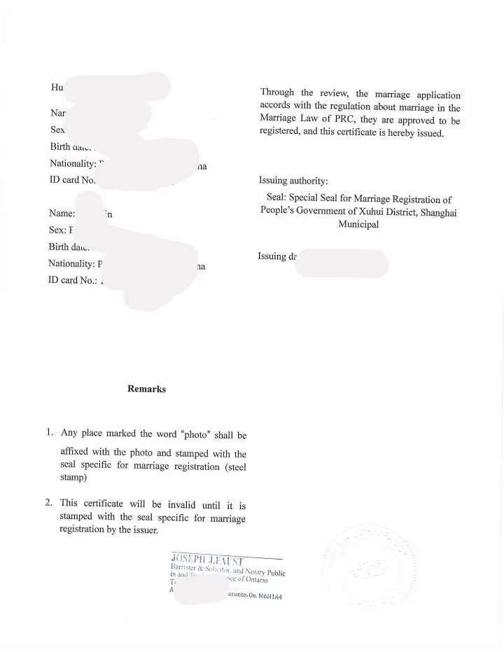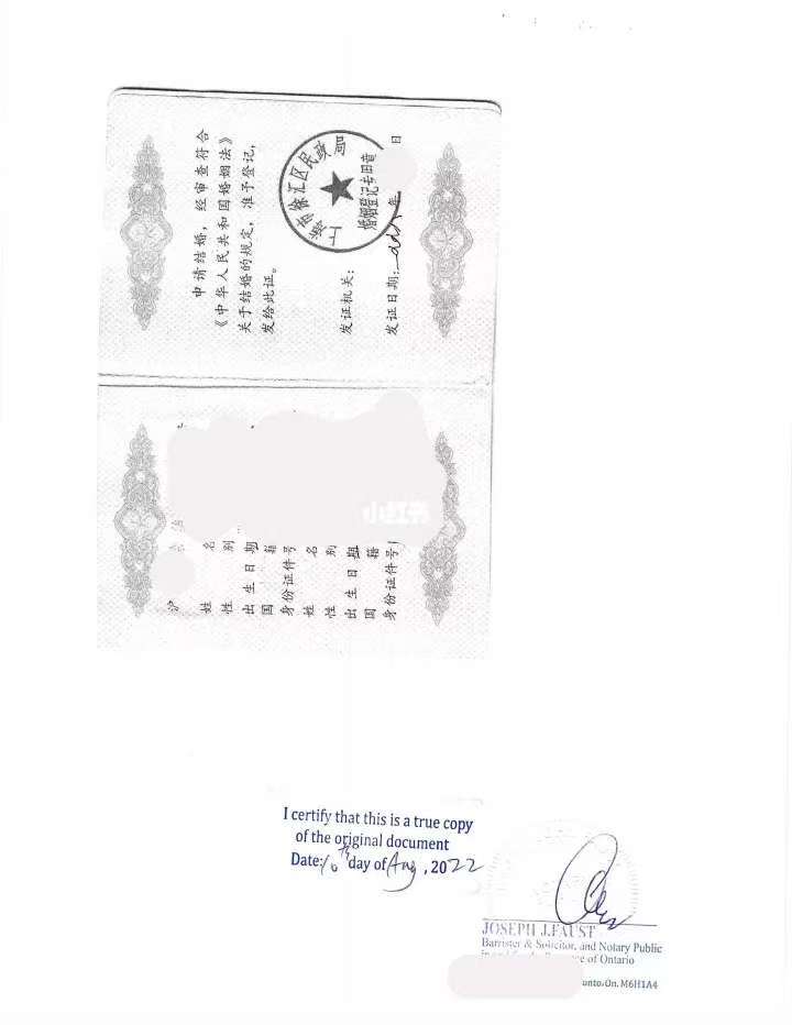 这里发布的是加拿大公证处完成的一份中国结婚证的翻译公证件。
