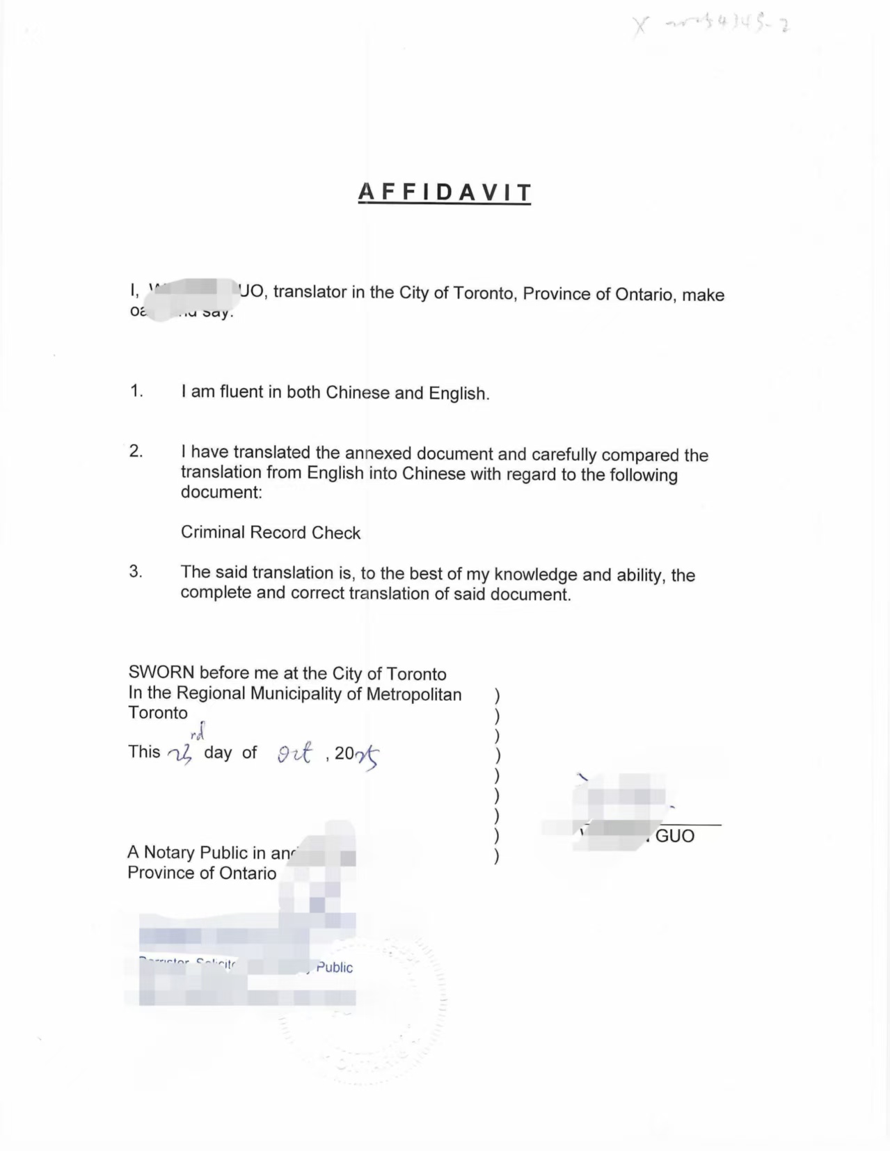 近日,华译网加拿大翻译与公证处刚刚为一对居住在安省的华人夫妻——Mr. Kevin L. 与 Mrs. Alice W.,成功完成了加拿大皇家骑警(RCMP)无犯罪记录附加证明书(Affidavit of Authenticity)办理。