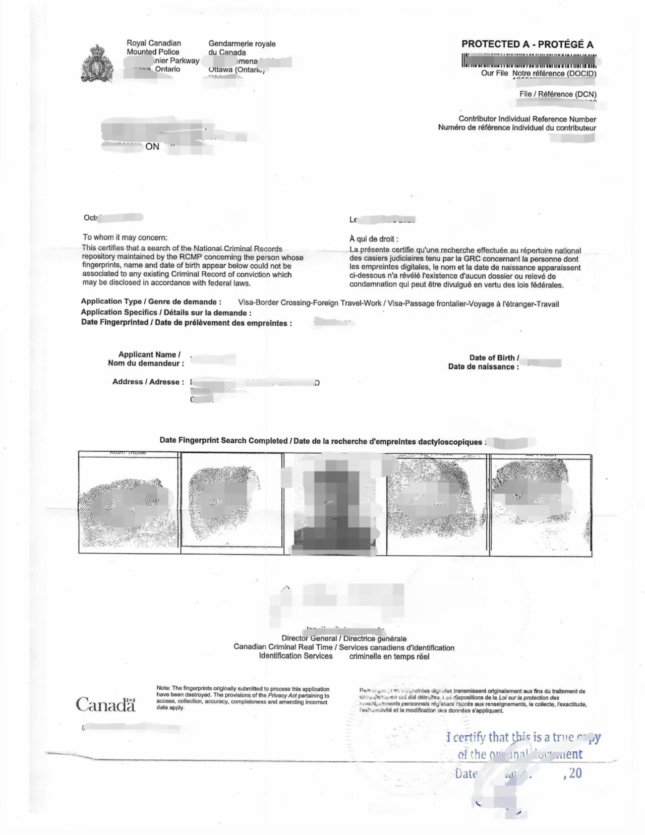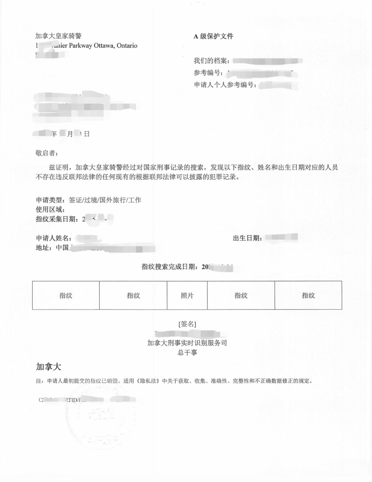 加拿大皇家骑警(RCMP)签发的无犯罪记录证明;