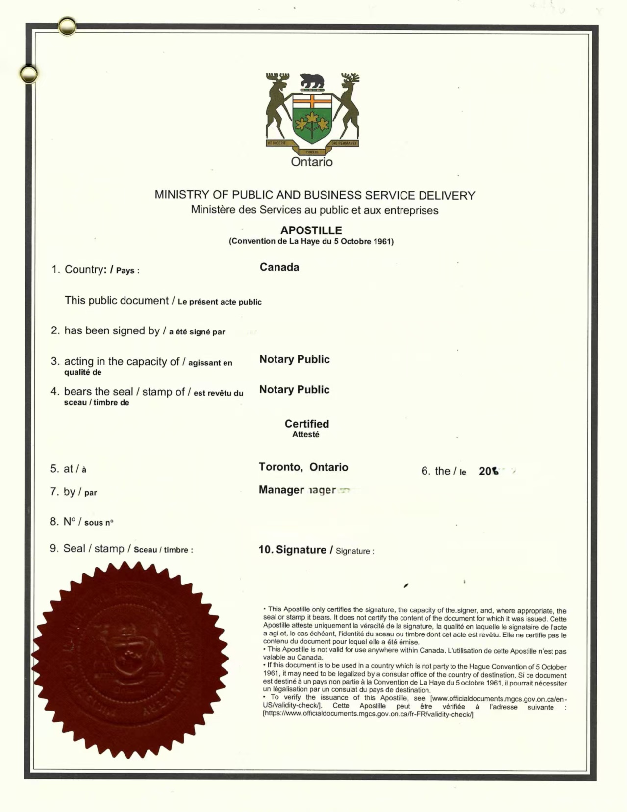 签署完成后,文件经律师公证(Notarization)并送交安省政府认证处(Official Documents Services, Ontario ODS)加贴海牙认证章(Apostille Seal)。
