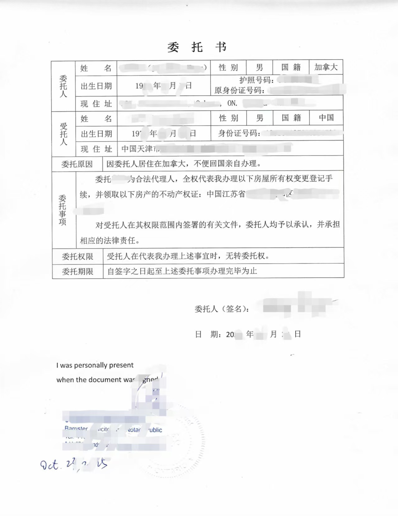 Mr. Wang 是南京一处房产的业主。因常年定居加拿大,无法亲自回国办理不动产所有权变更手续。为确保国内手续顺利完成,他决定委托其弟弟 Mr. N. Wang 在国内全权代理,代为处理房屋变更登记、签署相关文件并领取新的不动产权证。