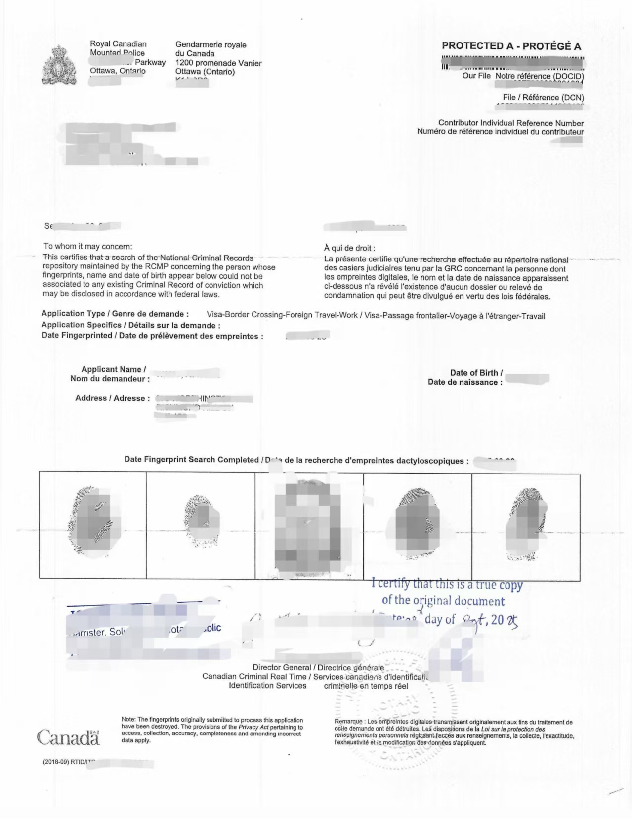 当事人陈岚(化名),居住于加拿大安大略省多伦多市,计划赴欧洲某国长期居留并设立投资公司。根据该国入境及金融监管要求,申请人需提交一份由加拿大皇家骑警(Royal Canadian Mounted Police, RCMP)出具的带指纹无犯罪记录证明(Certified Criminal Record Check with Fingerprints),并须经**海牙认证(Apostille)**后方可在欧洲使用。