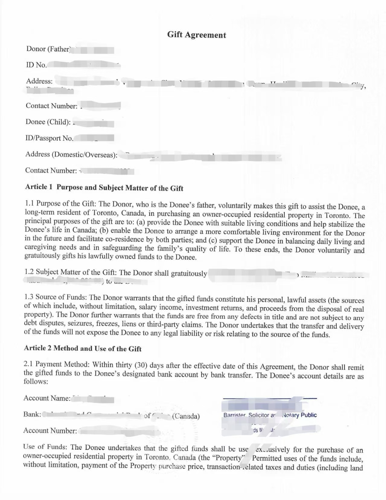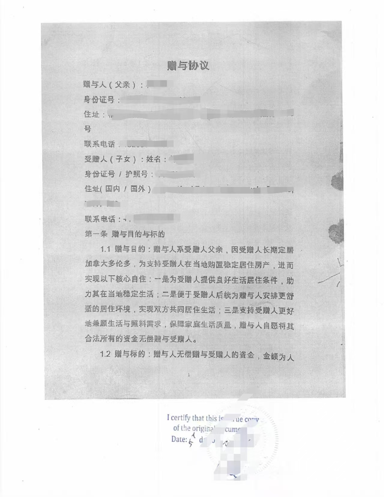 本案例为一起典型的中国父母向加拿大子女赠与人民币资金用于购房的翻译与公证服务案例。当事人系居住在福建的父母,欲赠与居住在加拿大多伦多的子女人民币两百余万元,用于在加拿大购买自住房产。为确保资金来源清晰、赠与行为合法合规、并能在加拿大税务局(CRA)或银行审查中提供充足证明,当事人决定签署正式的《赠与协议》,并在加拿大进行英文翻译及公证认证。