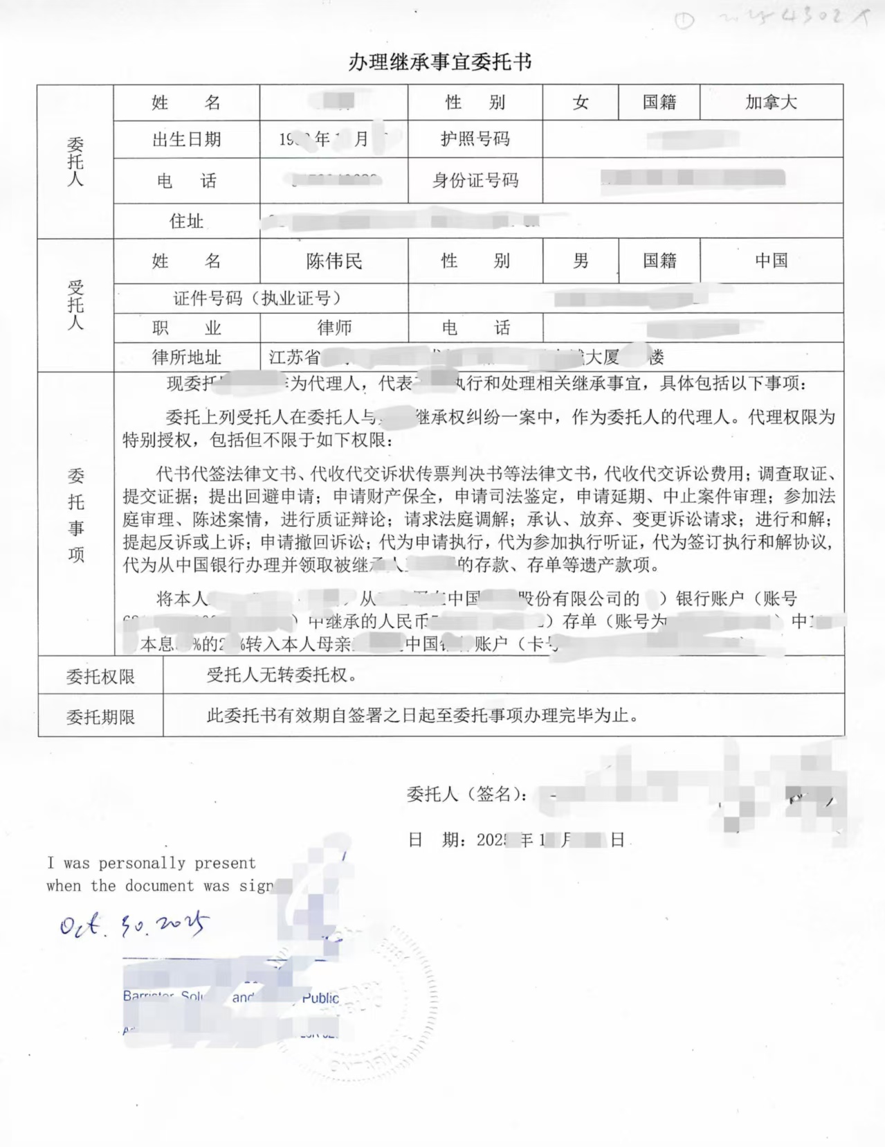 当事人为现居加拿大多伦多的华人公民,其父亲去世后在国内留下部分遗产,包括银行存款与不动产收益。由于继承人之间就遗产分配问题产生纠纷,国内法院已受理诉讼。因当事人身在海外、无法亲自回国参与诉讼及执行程序,需委托国内律师代理诉讼与遗产收取。为确保委托文件在国内具有法律效力,当事人决定通过华译网公证处办理《继承纠纷与收款委托书》公证及**海牙认证(Apostille)**手续。