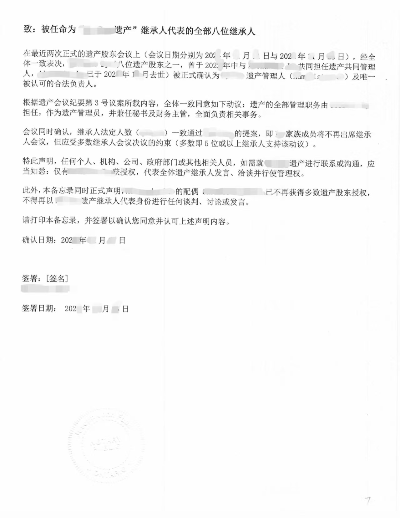 经两次正式遗产会议(2024年11月11日与11月23日)一致表决,确认陈伟仁(化名)为遗产合法管理员及唯一代表;