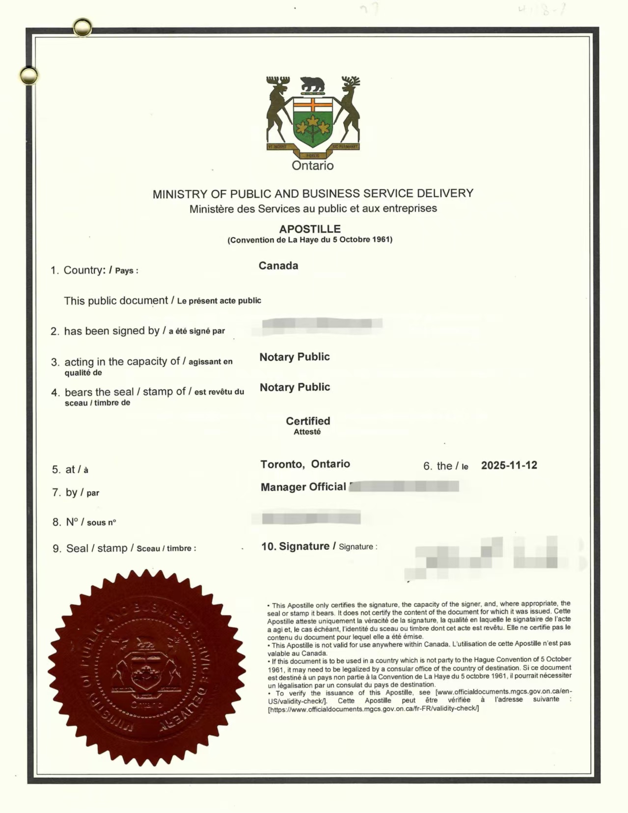 文件提交至不列颠哥伦比亚省政府认证处(BC Authentication Office)加贴 Apostille 证书,确认律师签名与印章真实有效。