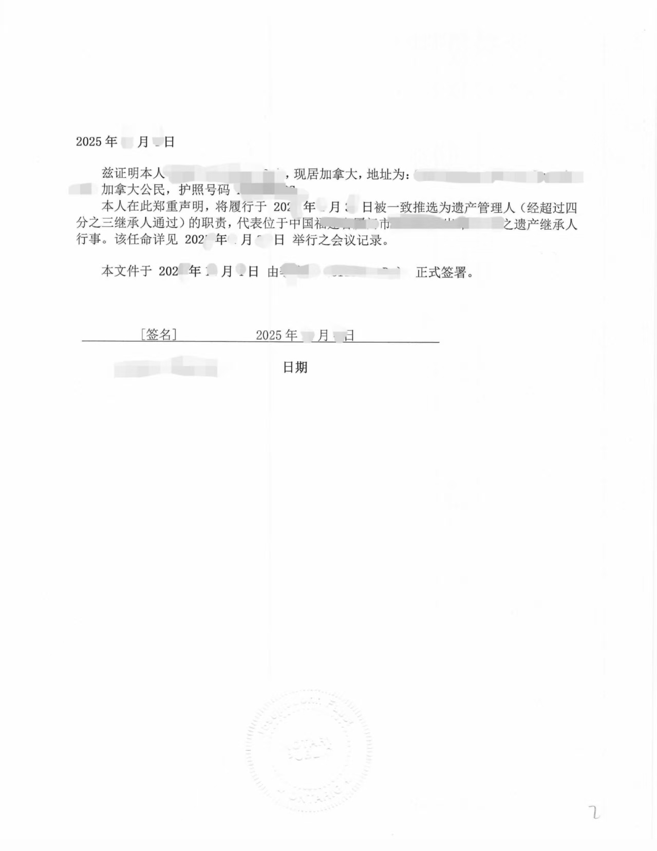 祖父早年移民加拿大,于当地去世后未立遗嘱。其在中国境内的房产与银行账户需经合法授权方能处理。经过全体继承人协商,家族一致推举居住在加拿大多伦多的林家诚(化名)先生作为遗产管理人(Estate Administrator),全权负责代表家族办理中国境内遗产继承、税务及资产分配等相关事务。