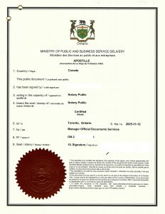 文件送交安大略省政府认证办公室(ODS),加贴 Apostille Certificate,确认律师签字及印章的真实性。