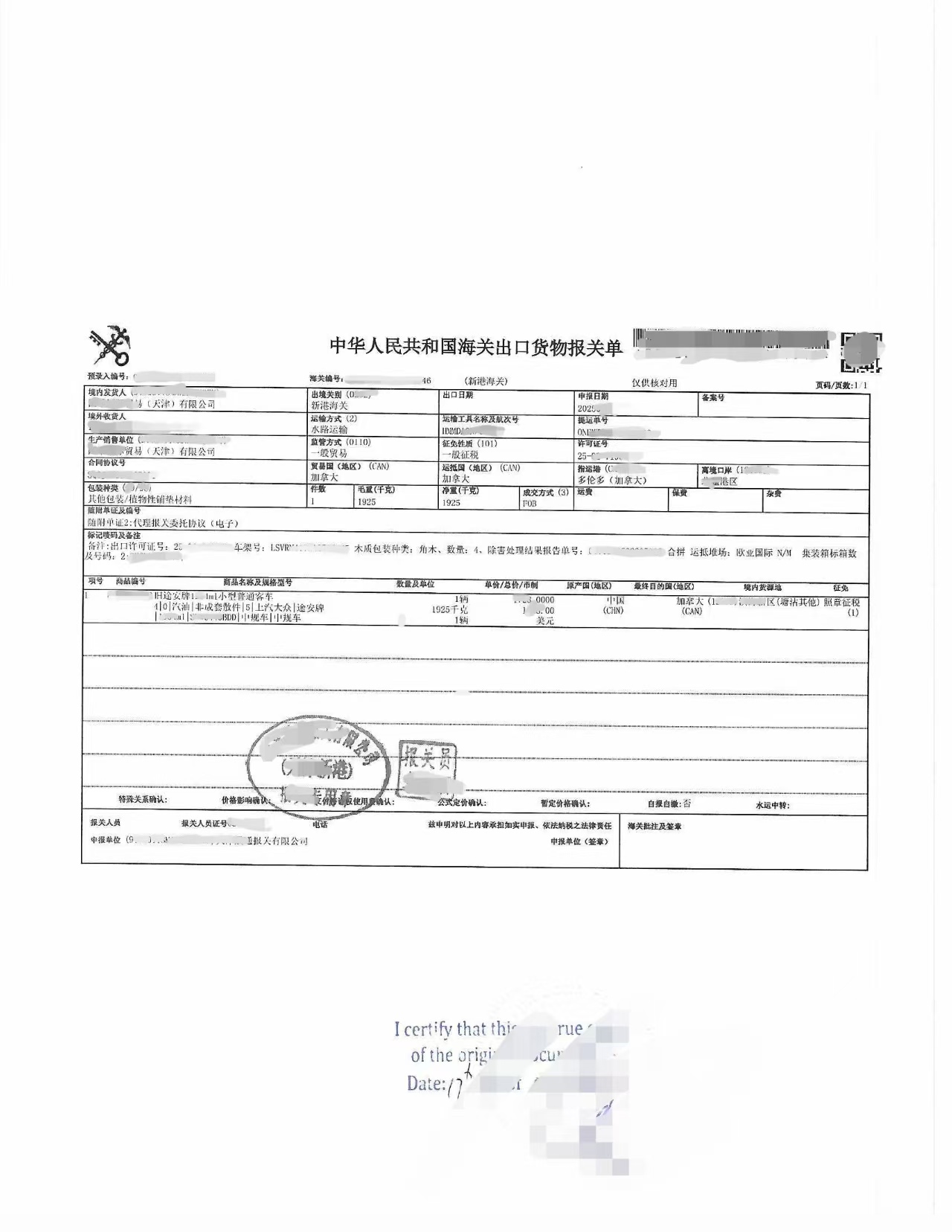 客户从中国出口一批机械配件至加拿大,收货方在加拿大通关时,需要提供 中国海关出口货物报关单(Export Goods Declaration Form)英文版本 及其 公证件,以便加拿大边境服务署(CBSA)核查货物来源、数量与申报信息。由于原始报关单为中文,必须在加拿大进行 中译英翻译 + 公证,并要求 当天出具,以免延误清关。