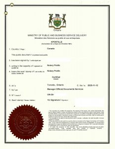 公证文件递交至加拿大及菲律宾的官方认证机构加贴Apostille证书,确认签字、印章与律师资格真实有效。