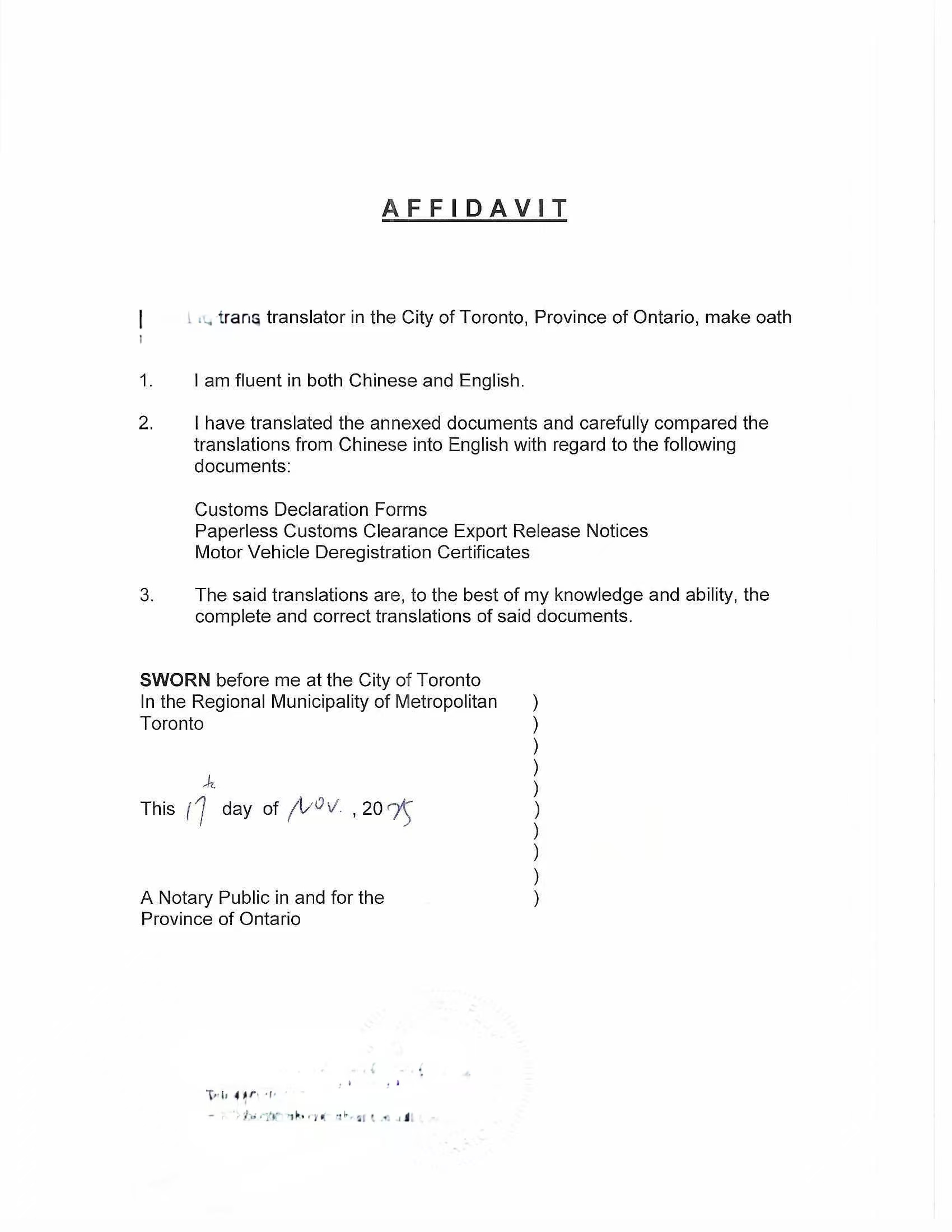 由于原文件为中文,加拿大清关代理及 CBSA 需英文版译本,客户选择在加拿大直接办理 中译英翻译 + 公证,并要求 当天出具文件 以避免滞港费。