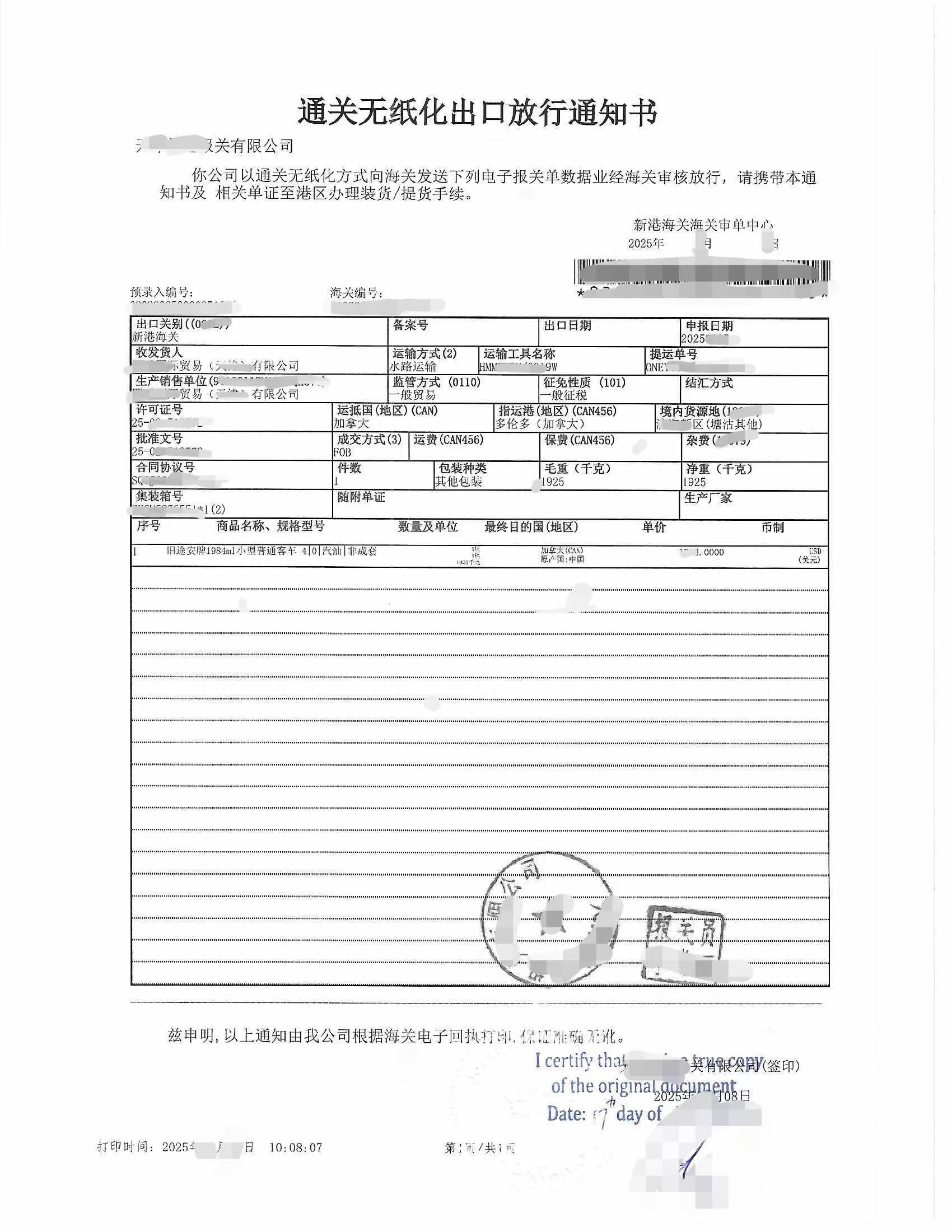 客户从中国出口一批食品加工设备至加拿大,货物到达加拿大港口后,加拿大进口清关代理要求提供中国海关出具的 《通关无纸化出口放行通知书》英文版本及公证件,用于核实该货物已在中国合法出口并完成放行手续。
