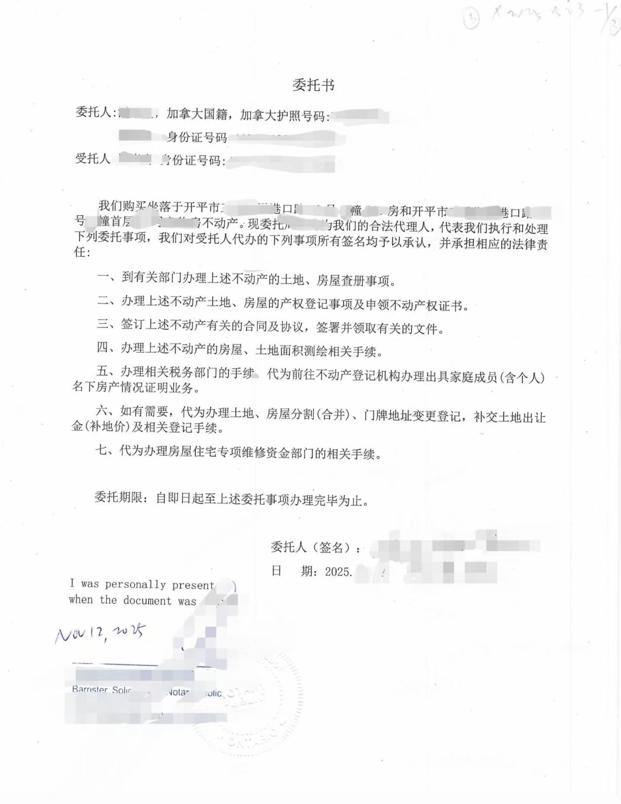 许多居住在加拿大的华侨因无法回国处理国内房产买卖,需要委托国内亲属代办。本案例介绍一份在 多伦多现场公证 + 海牙认证 的中文房产买卖委托书。