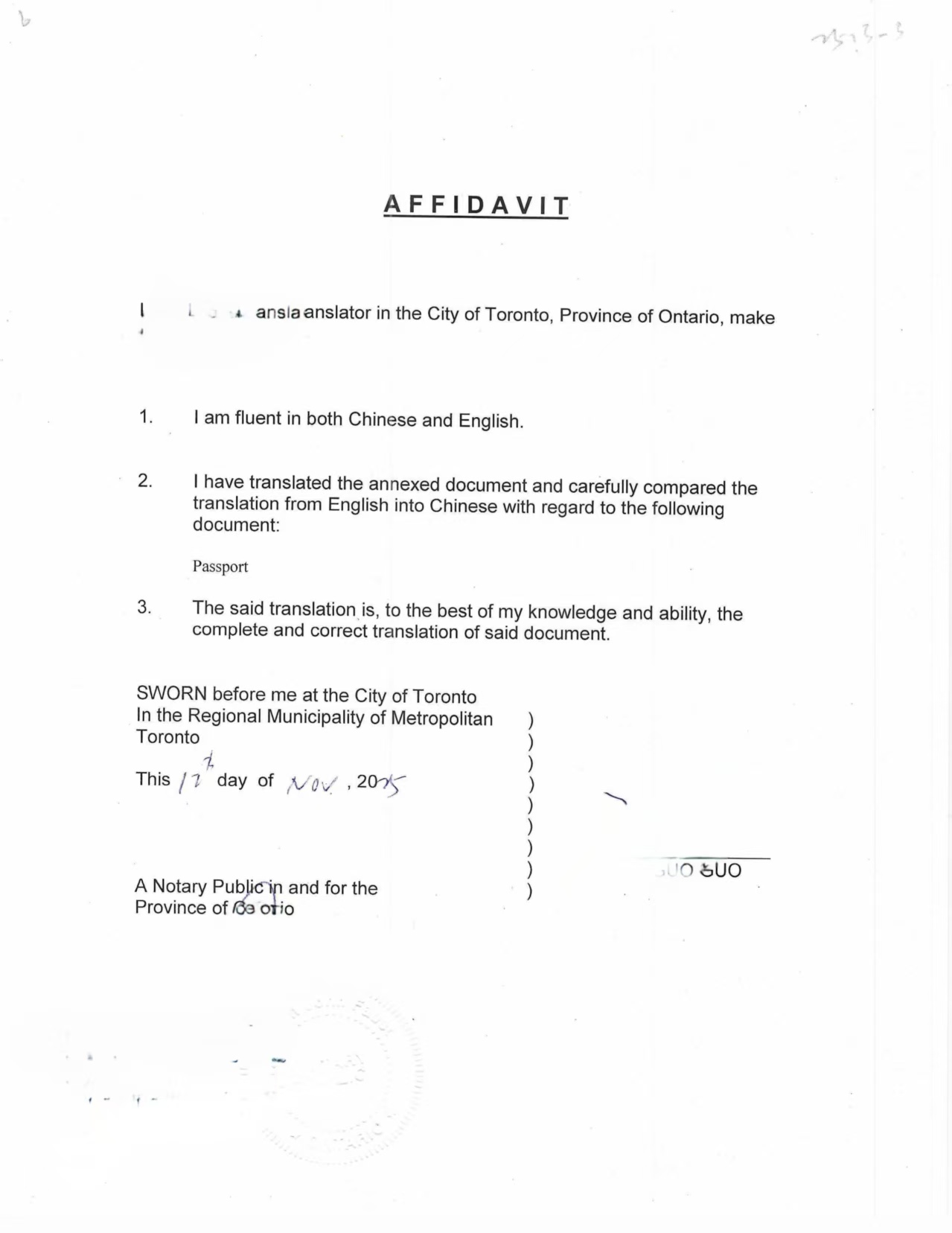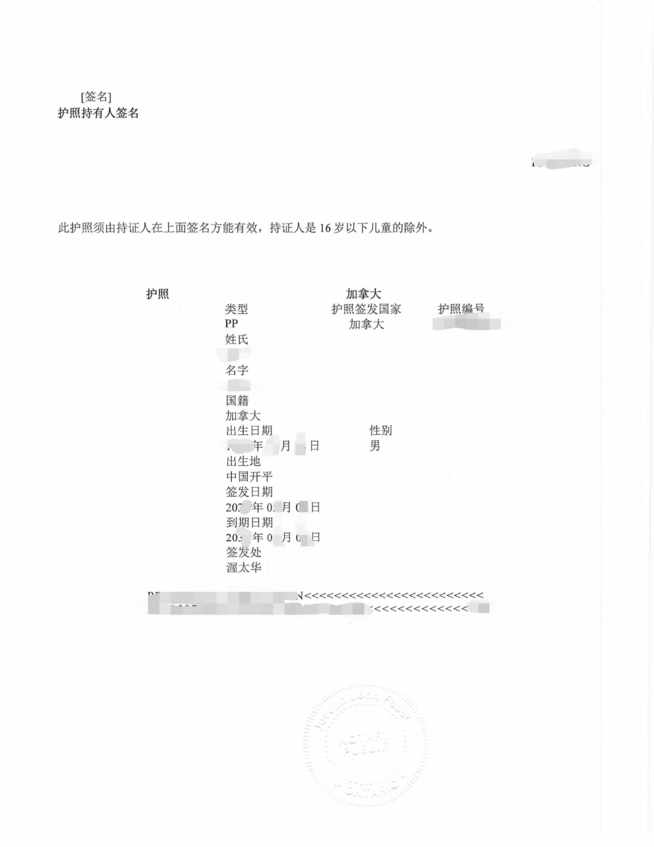 由于中国境内不接受英文护照直接作为办理房产过户的身份证件,必须将护照内容完整翻译成中文,并由加拿大公证律师见证签名。本案中,护照译本内容(已脱敏)如下: