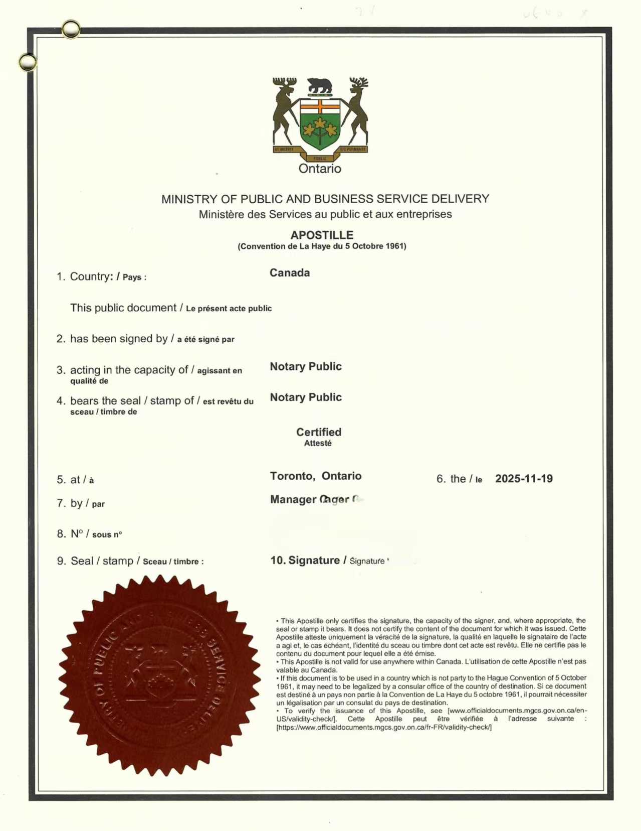 加盖安省政府钢印和 Apostille 号码