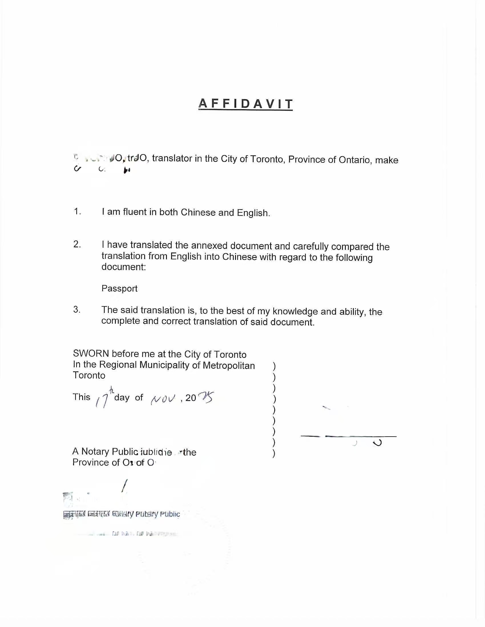 2. 翻译宣誓书(Affidavit)签署
