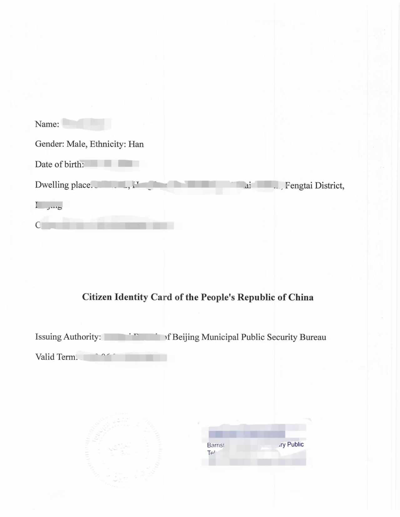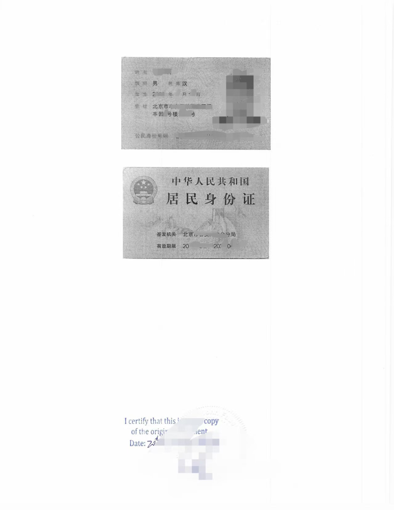 中国公民赴加拿大学习、工作或定居,涉及家庭团聚、配偶移民、永久居民(PR)申请等事项时,原始中文证件(如身份证、出生证明、户口本等)往往需要提供英文版本,并需在加拿大完成正式翻译公证。下面以一位居住在多伦多的客户为例,介绍“北京公安局丰台分局签发身份证”的翻译公证案例。