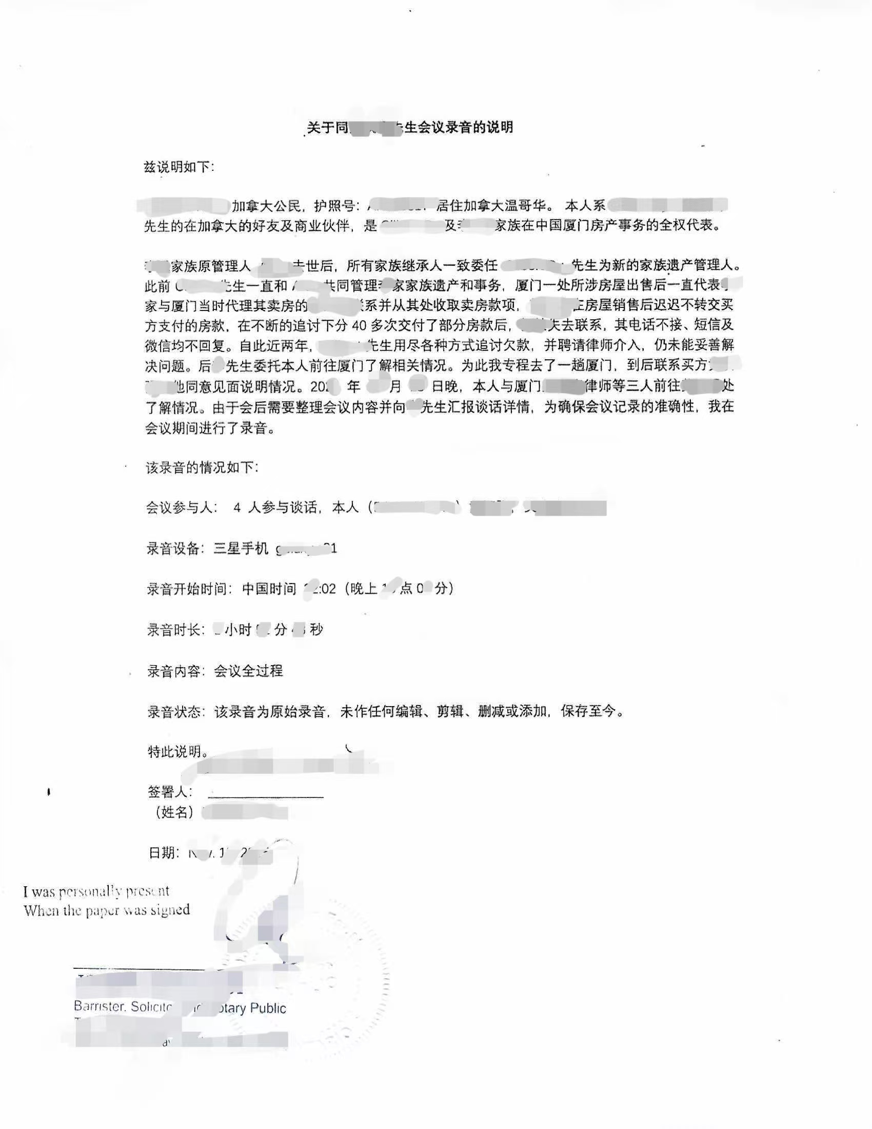林家几名继承人在重新委任林国仁为遗产管理人后,持续在国内追讨剩余房款。为了查明真相,吴建明作为林国仁先生的好友和商业伙伴,受托亲赴厦门与买方沟通。2024年10月13日,他与当地律师一起会见买方,整场谈话为了便于事后如实汇报及备存证据,他使用手机全程进行了录音。