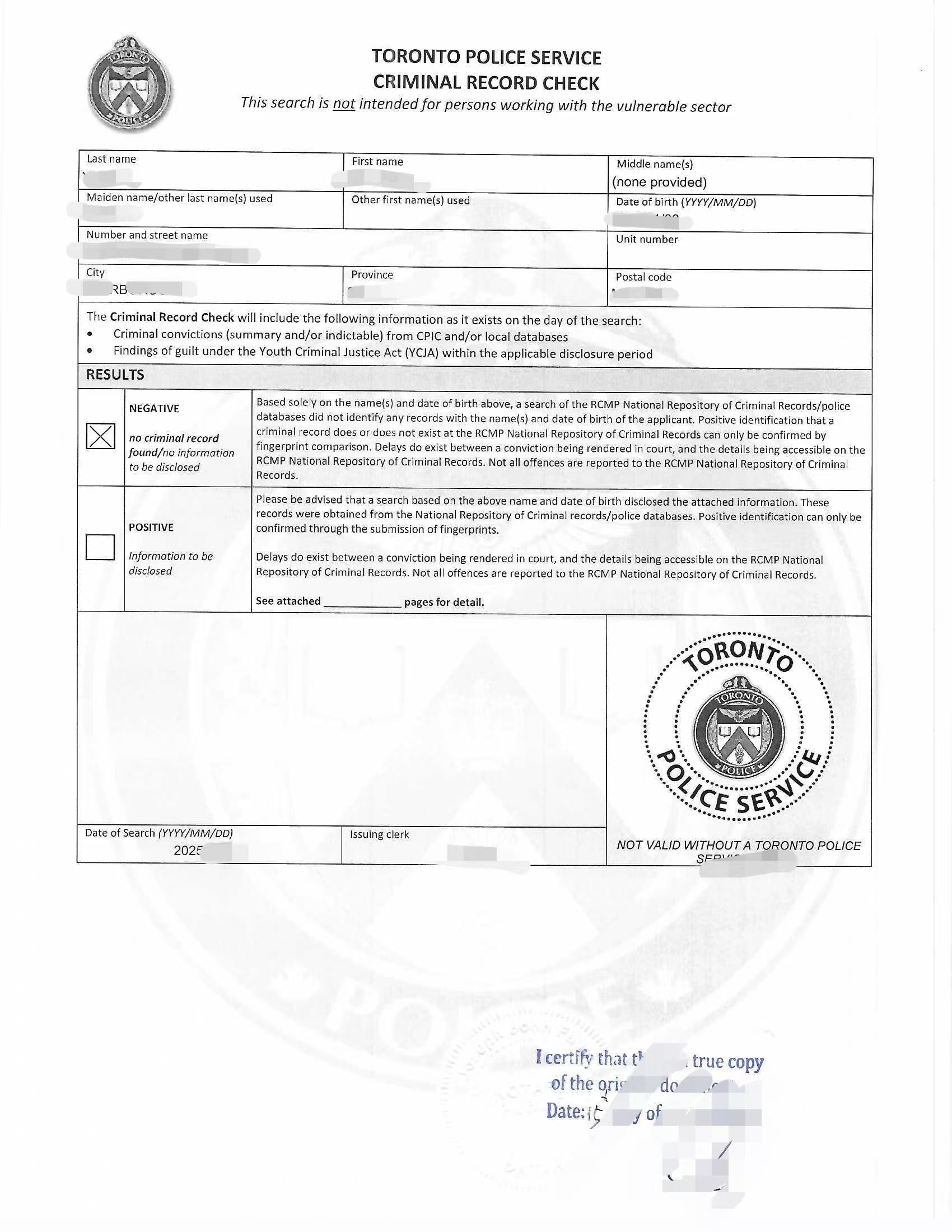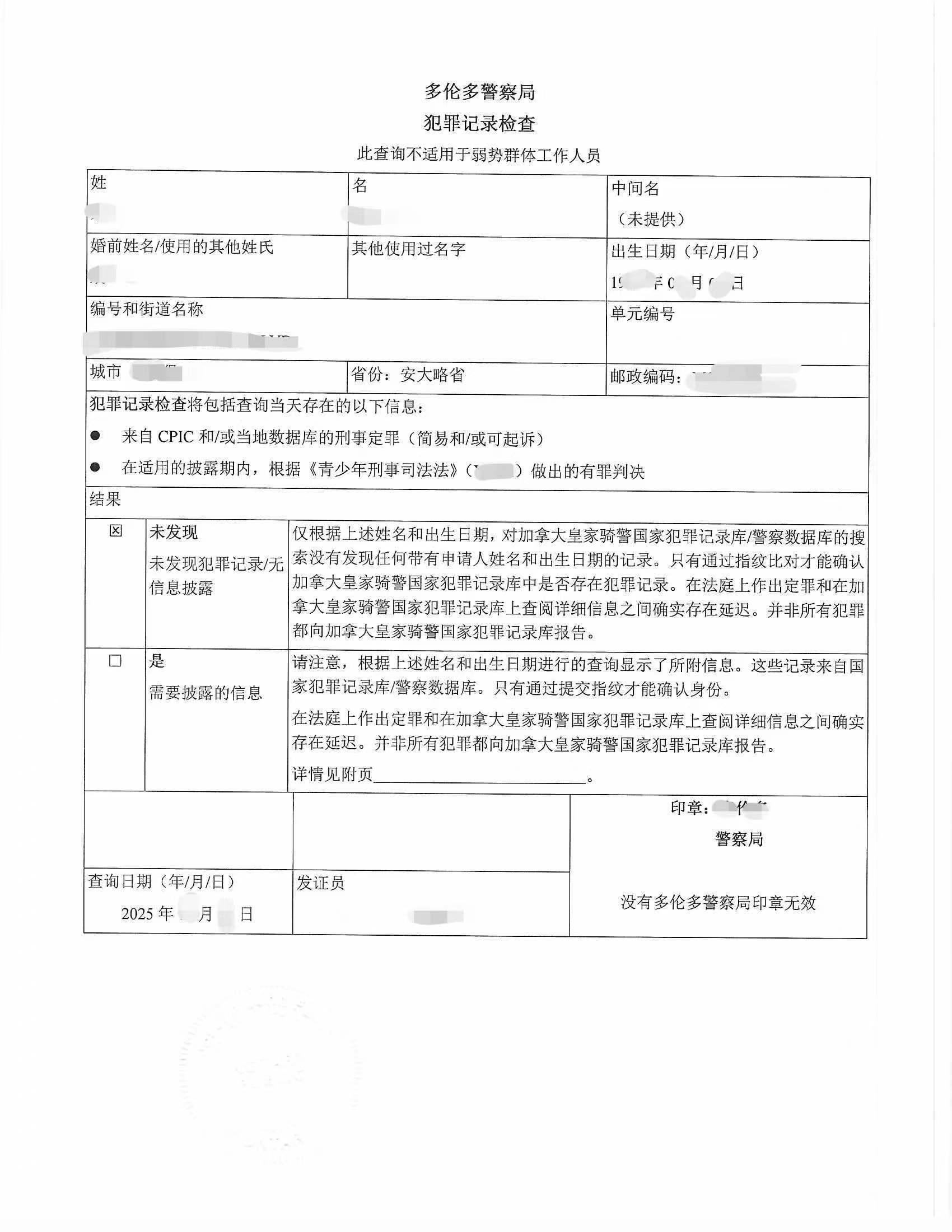 ✔ 多伦多警察局无犯罪记录证明