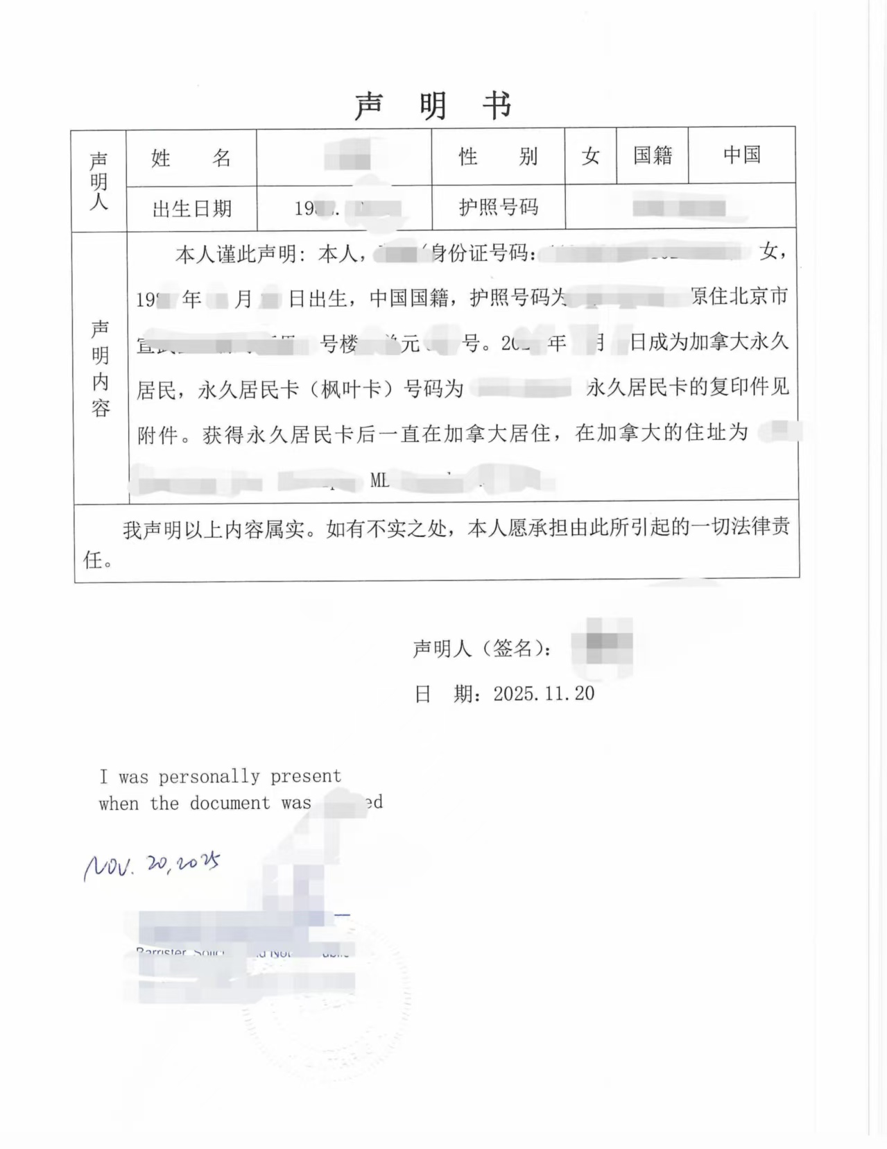 👉 签字:填写一份中文《PR身份海外永居声明书》