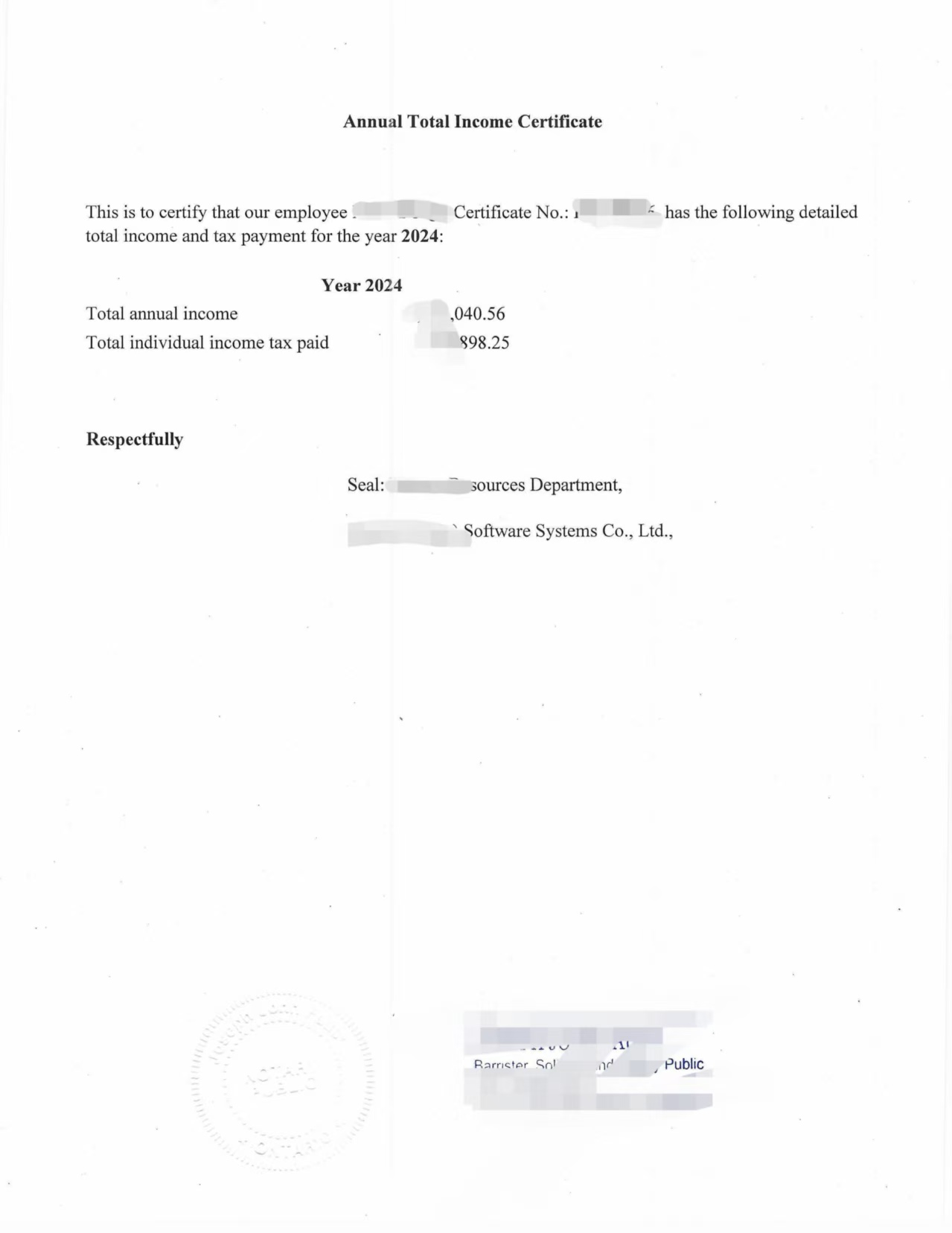 李明移民加拿大后,在完成报税及收入核查时,被要求补充其在中国就业期间的收入信息。其原始材料为中国公司人力资源部门出具的《年度总收入证明》,包括总收入数据、个人所得税缴纳情况以及企业盖章。文件为中文,需提供: