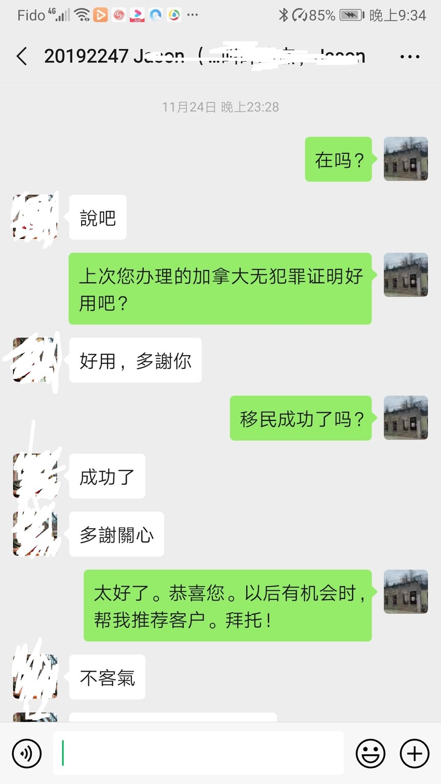 我们为很多加拿大籍的华人办理加拿大无犯罪证明,用于移民美国。其中一位已经成功移民美国,对我们的服务表示感谢,并给我们推荐来一位新客户。还有一位女士,拿到无犯罪证明后,一直不敢确定,这个无犯罪证明是不是美国移民局需要的格式,请我们再三核对,我们通过写信给皇家骑警、通过联系以前的客户寻求反馈,最终这位女士消除了疑虑,愉快地向美国移民局提交了加拿大无犯罪证明。