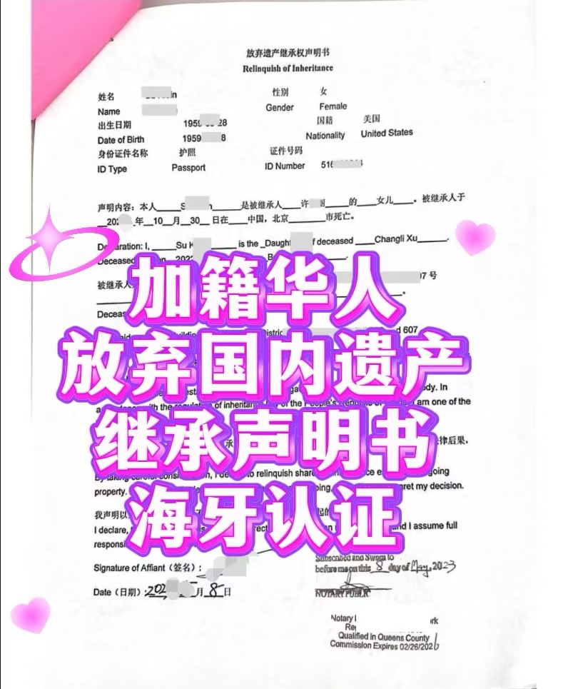 ·核心:中文《放弃遗产继承权声明书》(含被继承人信息、遗产明细、亲属关系、自愿不可撤销放弃意愿);加籍需附认证翻译机构英文译本 + 翻译员资质 + 真实性声明。