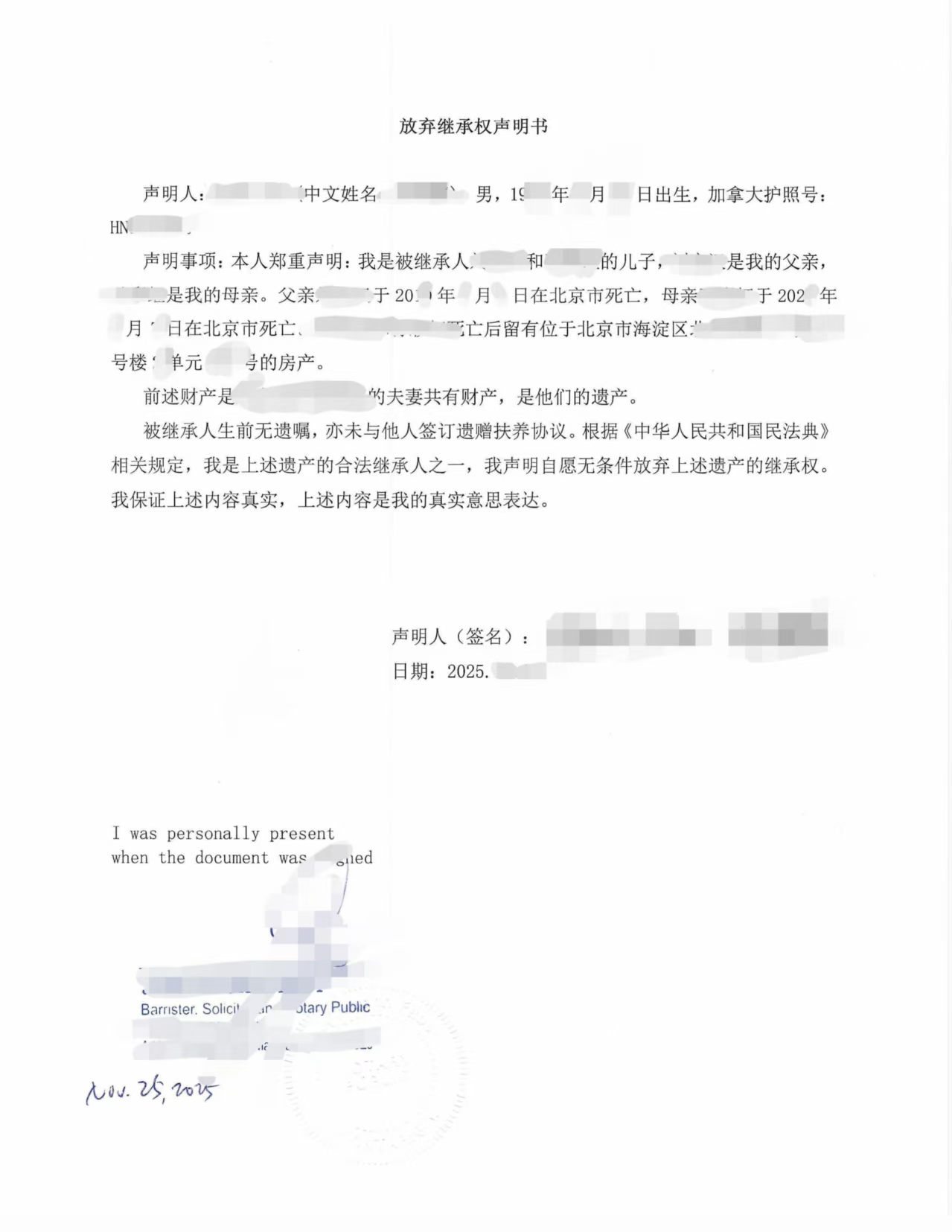 HAGUE APOSTILLE 加籍华人放弃继承北京父母遗产