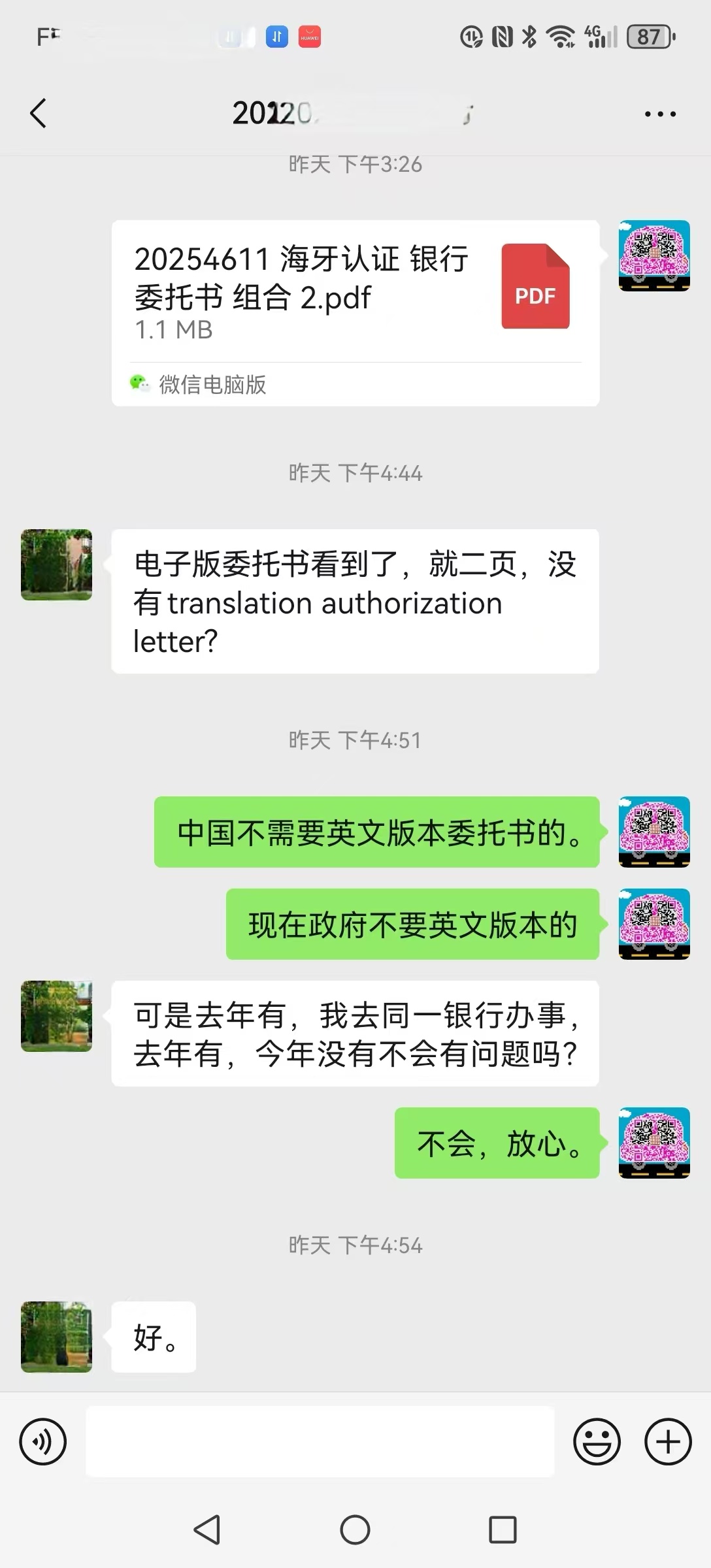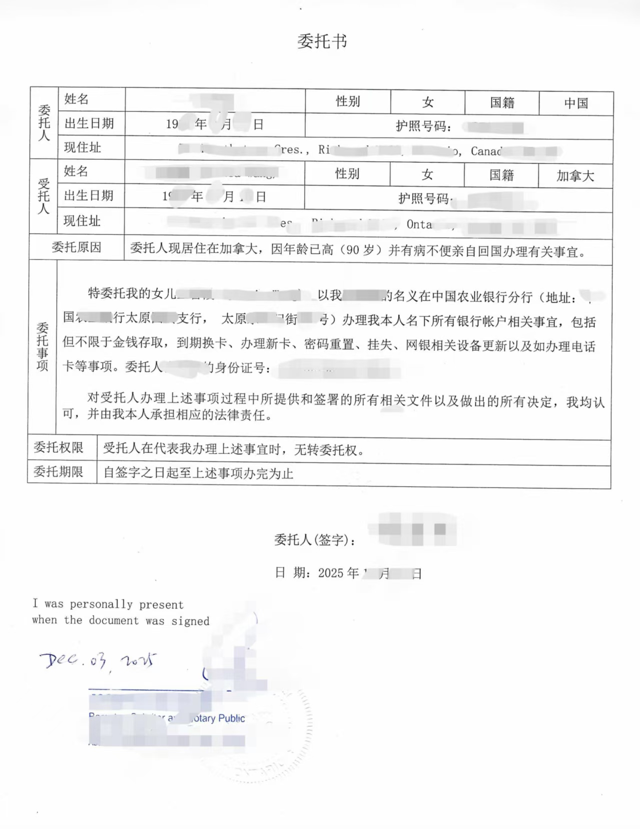 去年两位已经合作过一次,通过我们办理过农行委托书并顺利完成业务。今年银行又要求更新资料,于是她的家人再次联系我。