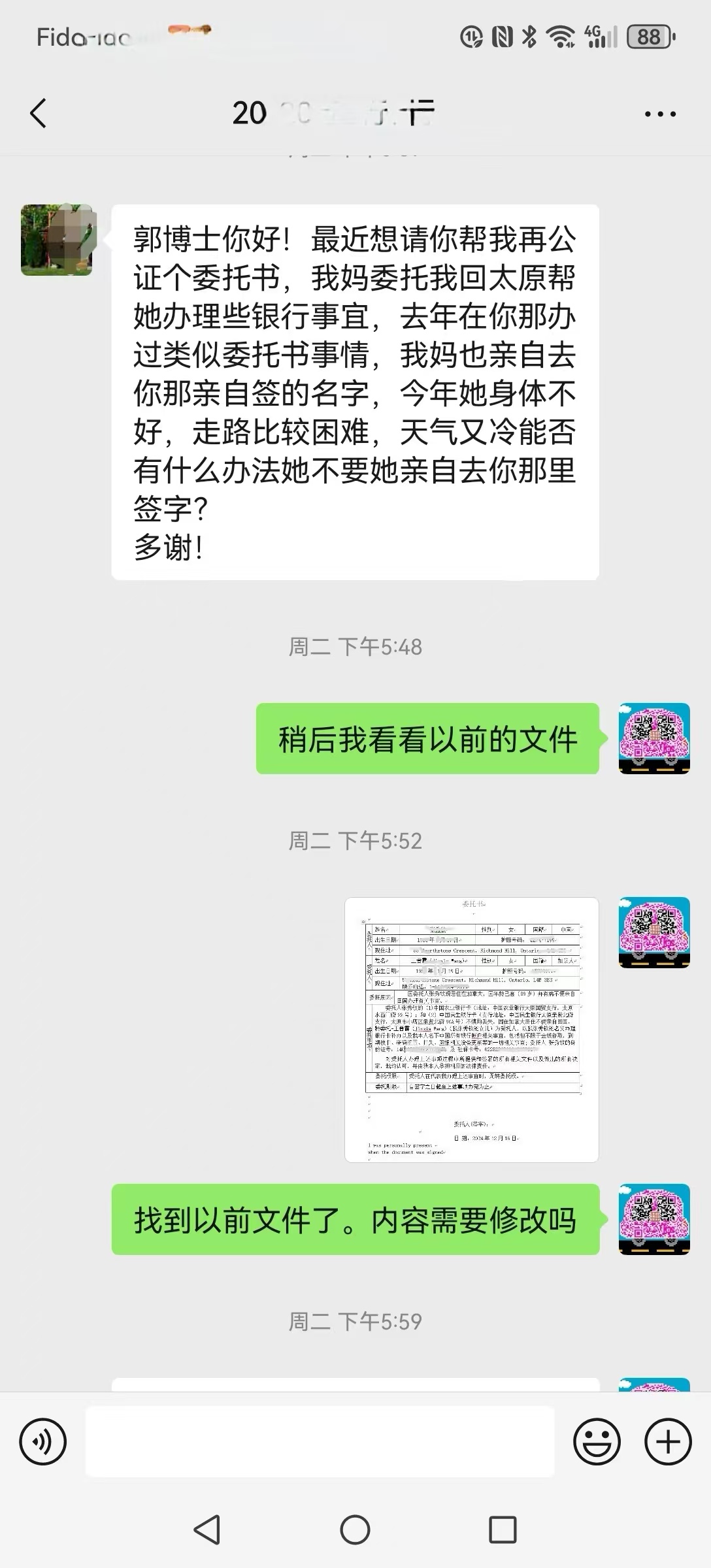 “郭博士你好!最近想请你再帮我妈公证一个委托书,我妈委托我回太原帮她办理农行业务,去年也在你那儿办过。”