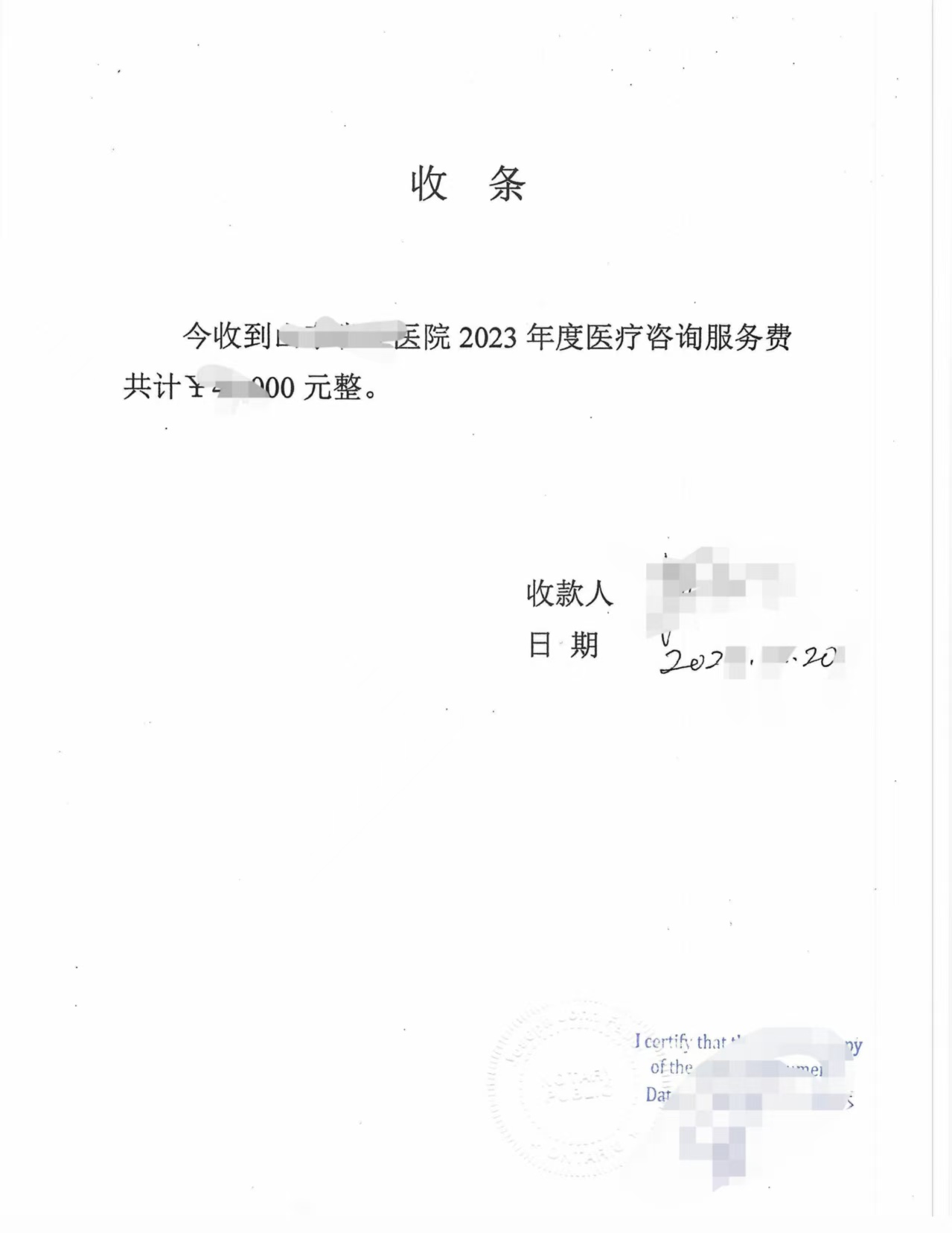 医疗收费收据则按加拿大医疗报税标准翻译成“Receipt for Medical Consulting Service Fee”格式,确保 CRA 可直接核对金额与医疗性质。