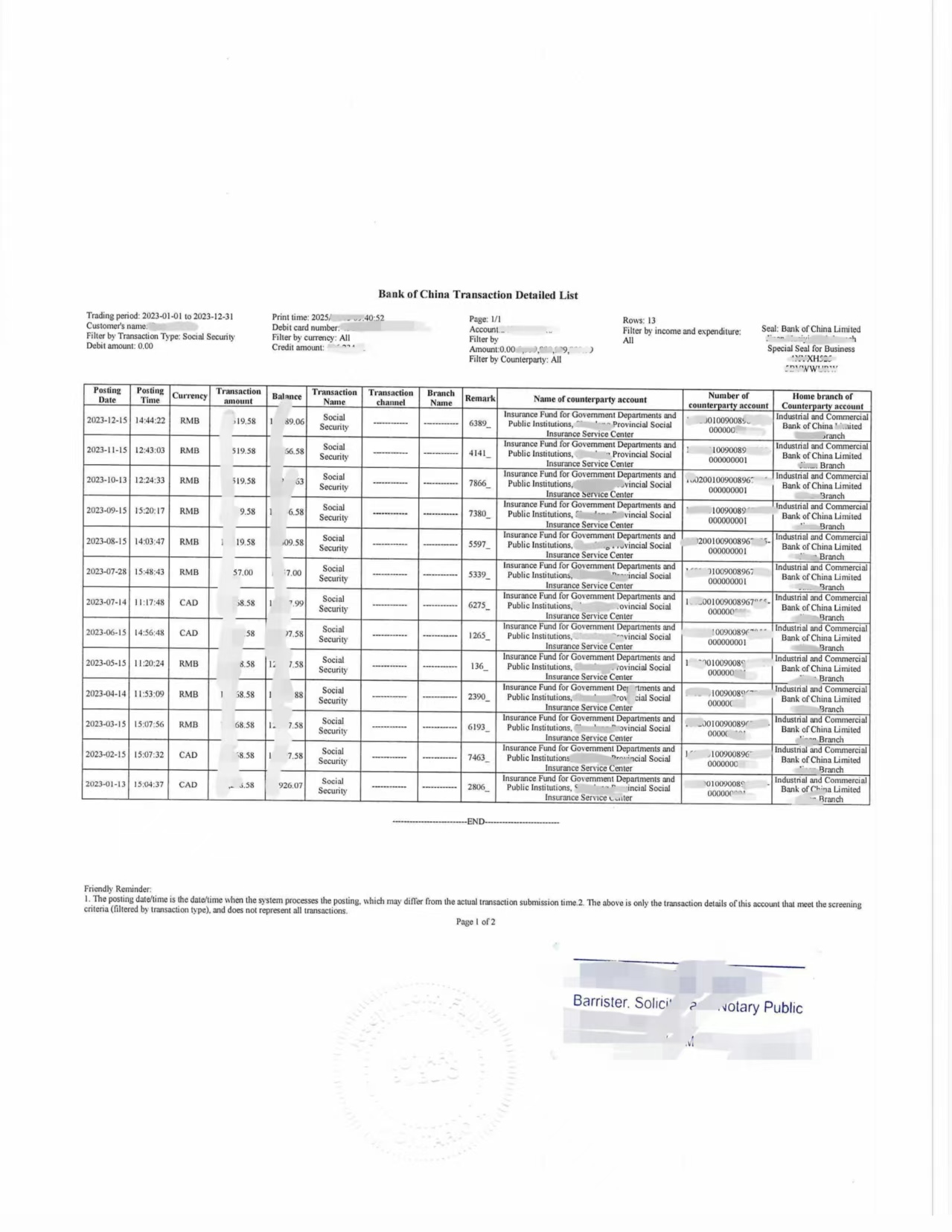 最近有一位来自山东济南的小伙伴 周婧柔(化名) 找到我们,希望把她的 中国银行交易明细、12 个月社保缴费单、以及山东省立医院的医疗服务收费收据全部做成加拿大税务局 CRA 可以接受的“中译英+宣誓+公证”材料。