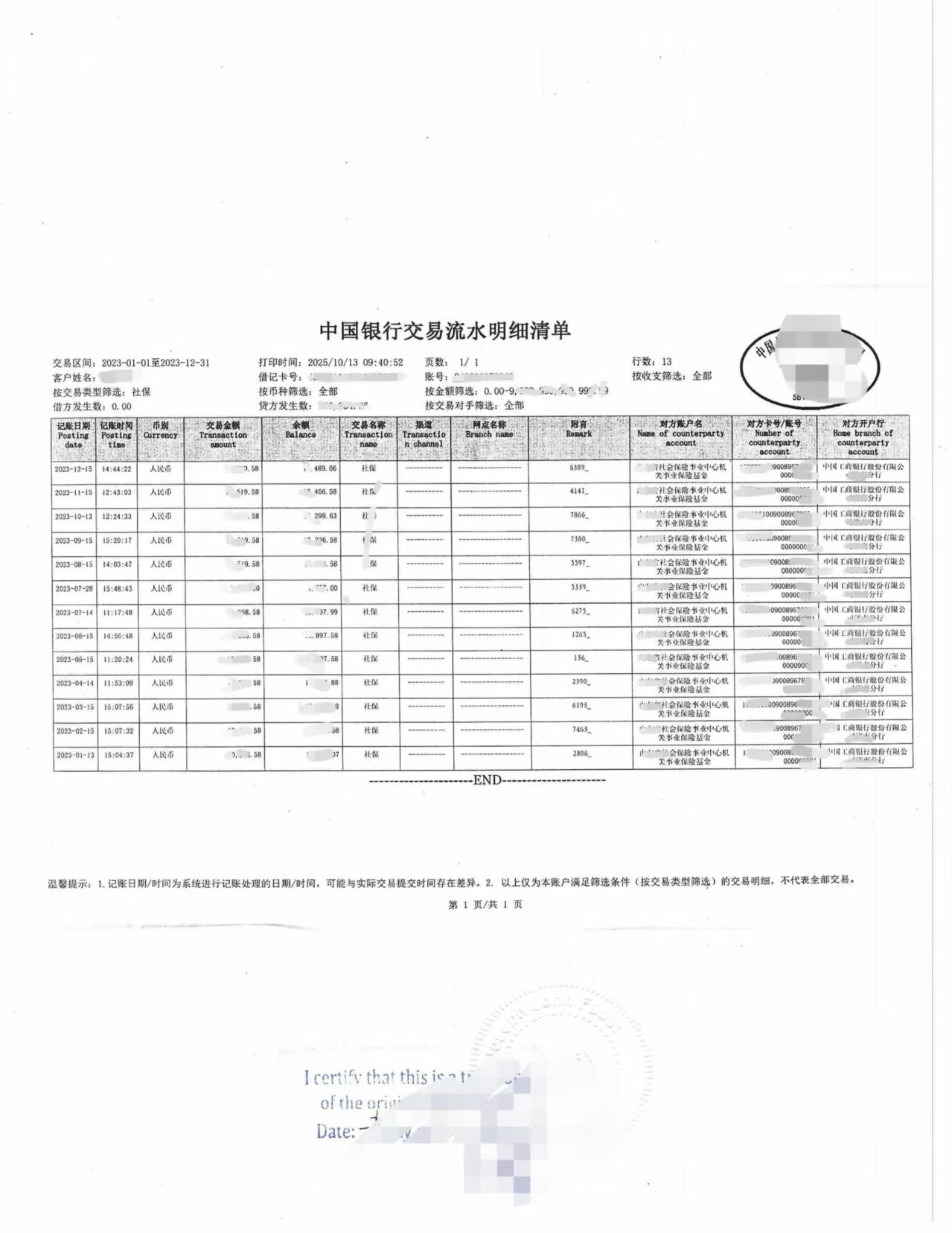 中国银行交易明细社保山东医院收据翻译公证