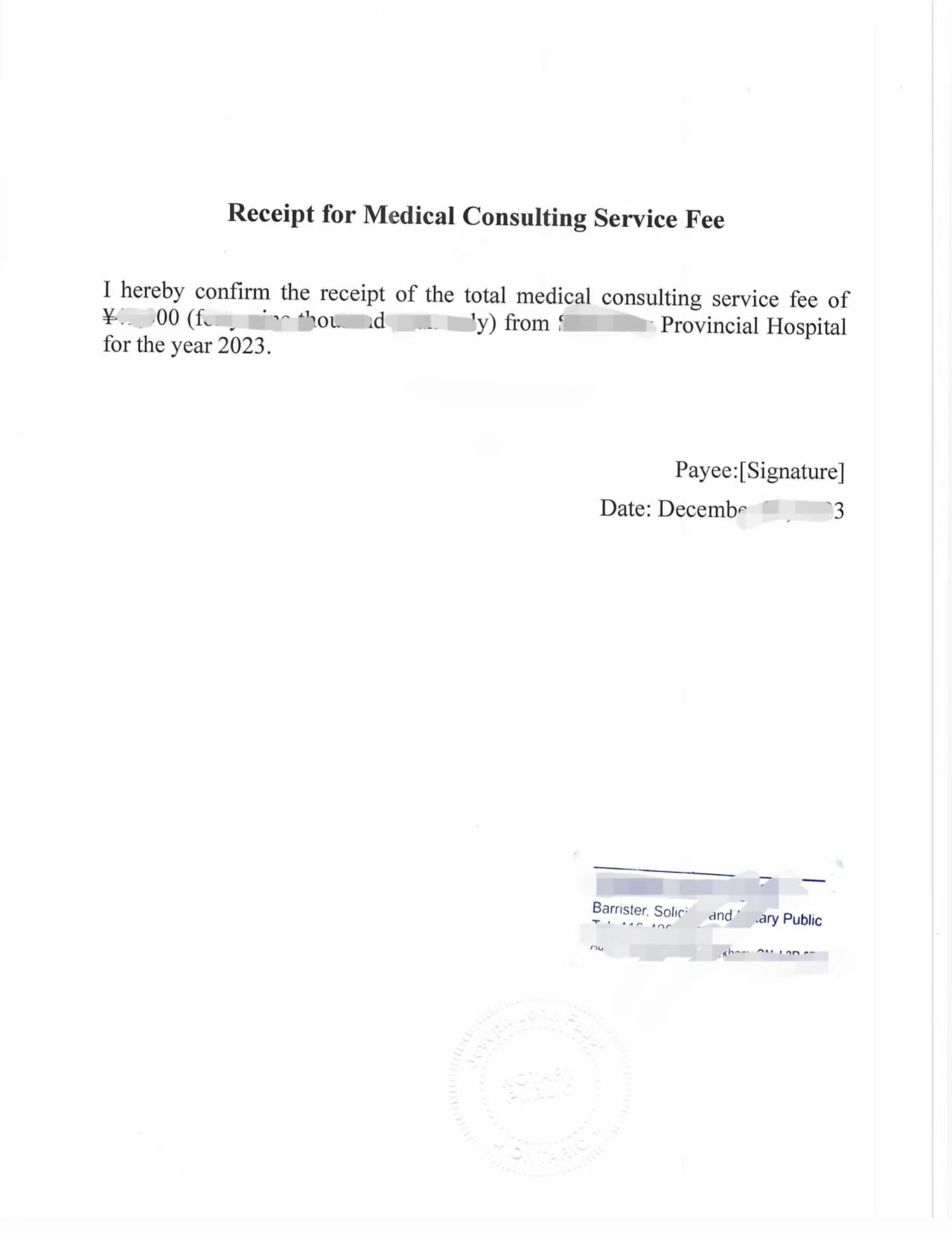 材料里有一张医院收据,显示“收到山东省立医院 2023 年度医疗咨询服务费,共计¥49,000 元整”,并附有收款人签名与日期 。