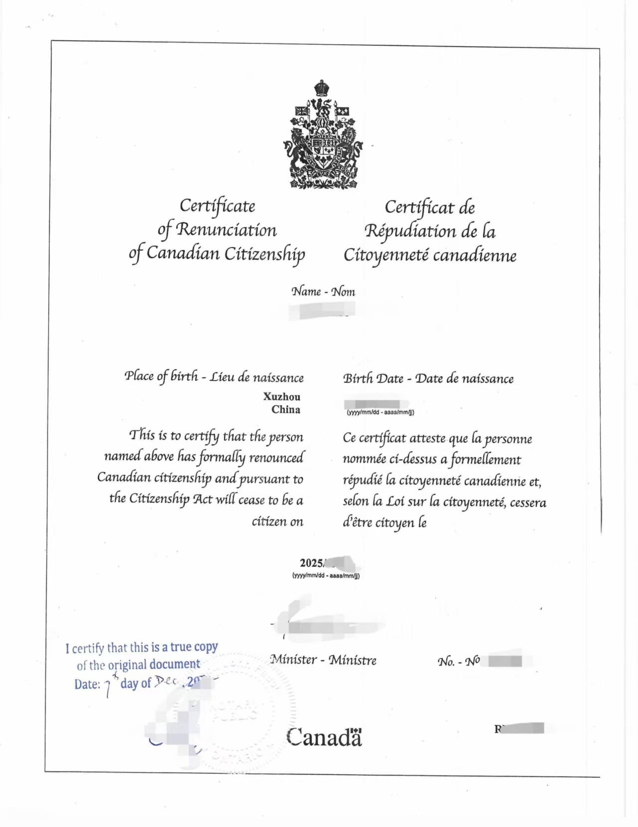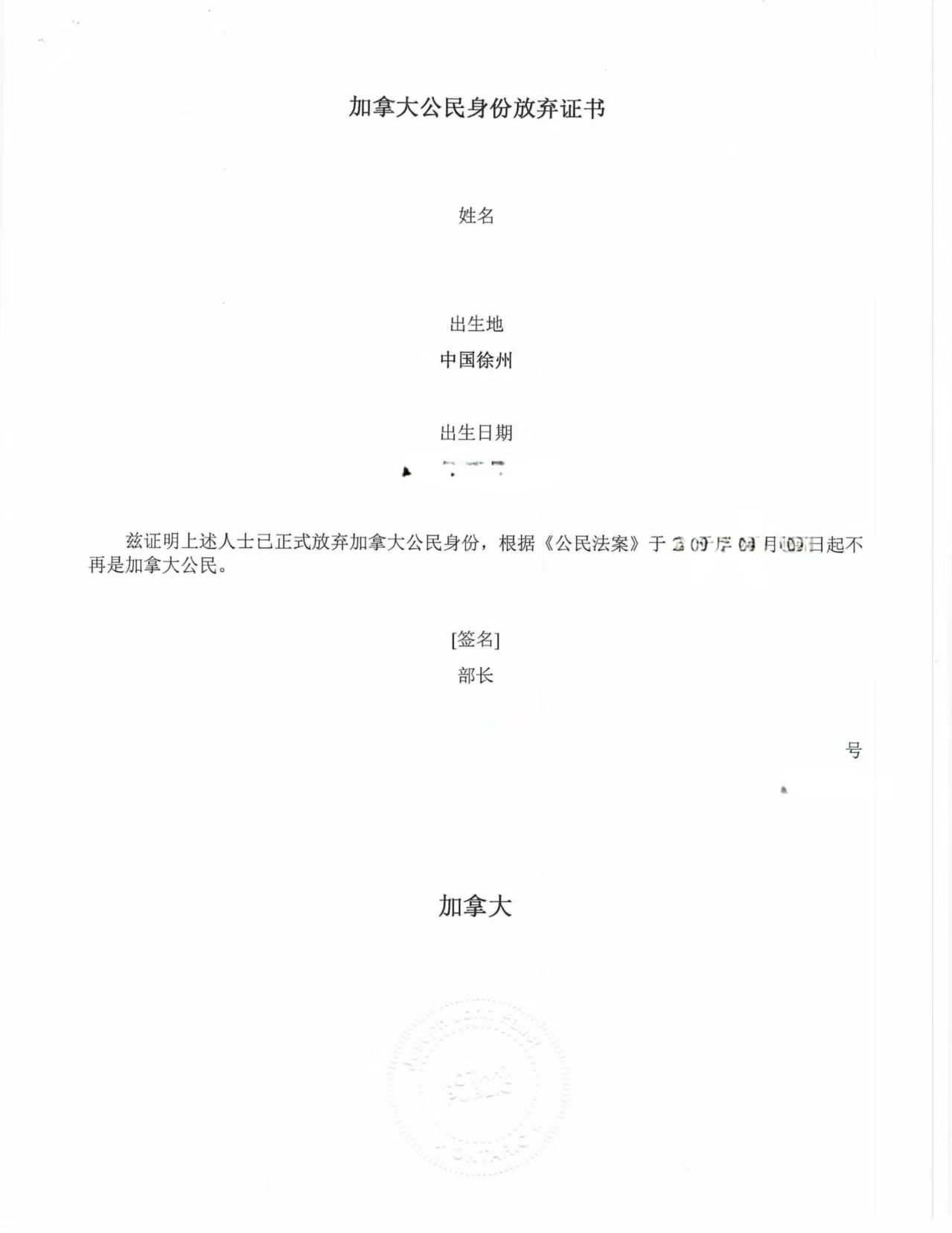 加拿大政府的 Certificate of Renunciation of Canadian Citizenship(加拿大公民身份放弃证书)