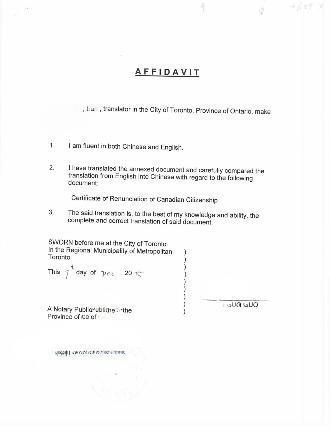 郭琳的文件是英文+法文,中国需要中文材料,所以翻译必须精准。宣誓文件里会写明: