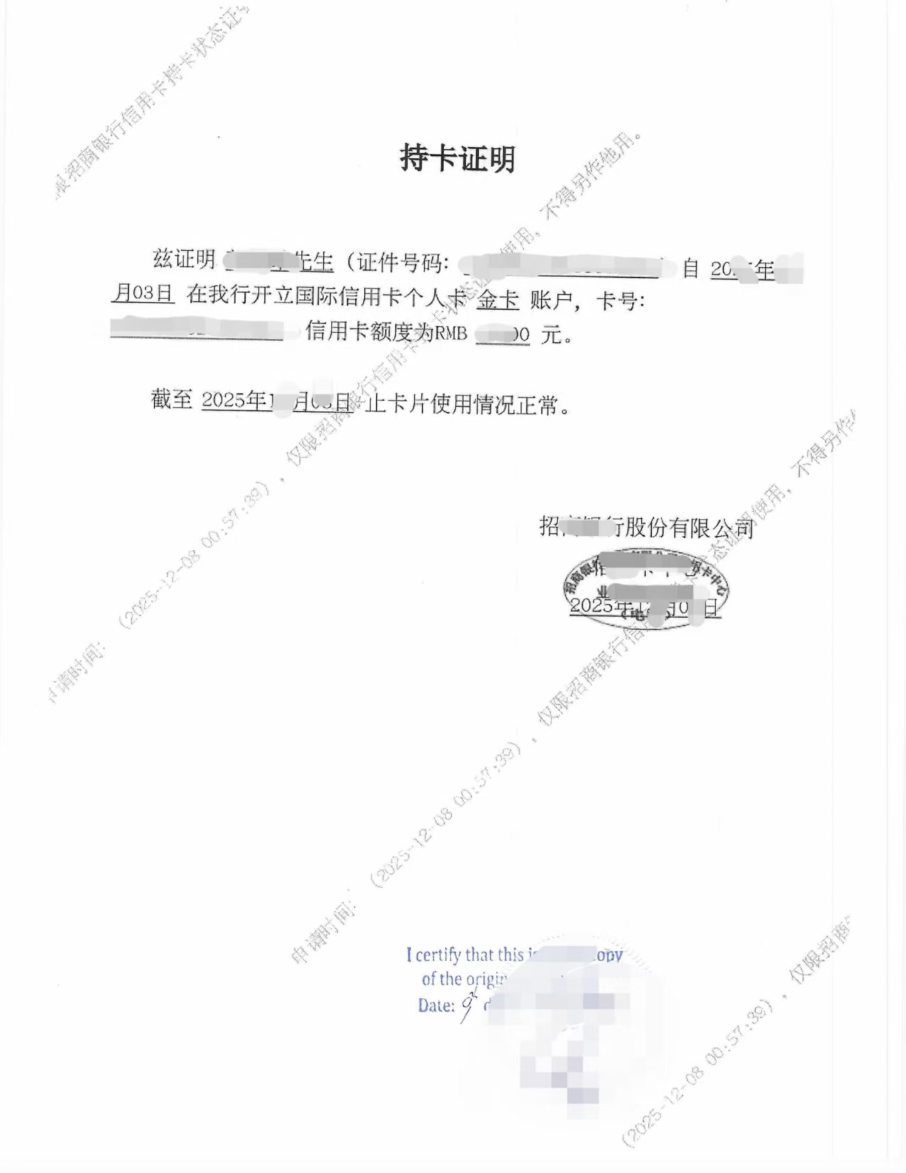 银行开具的 信用卡状态证明(Cardholding Certificate)