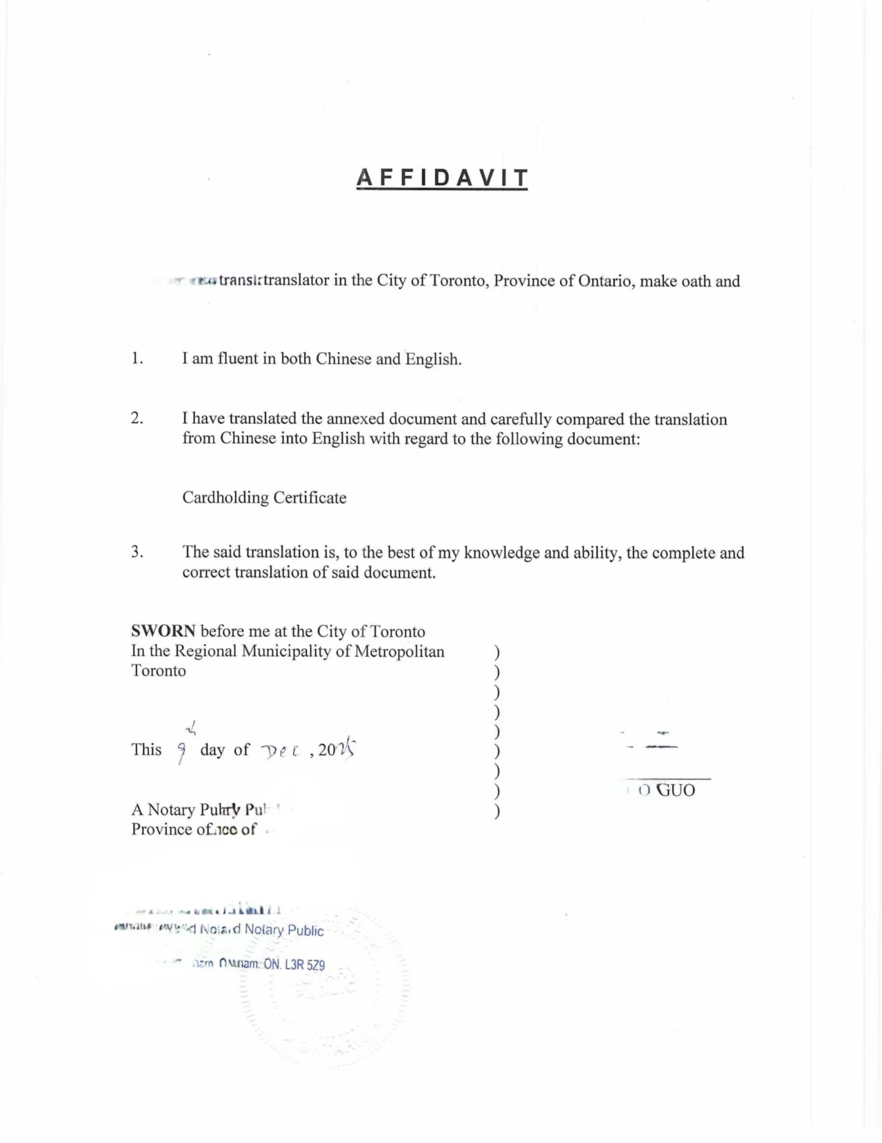 安排加拿大持牌公证人(Notary Public)认证翻译件真实性