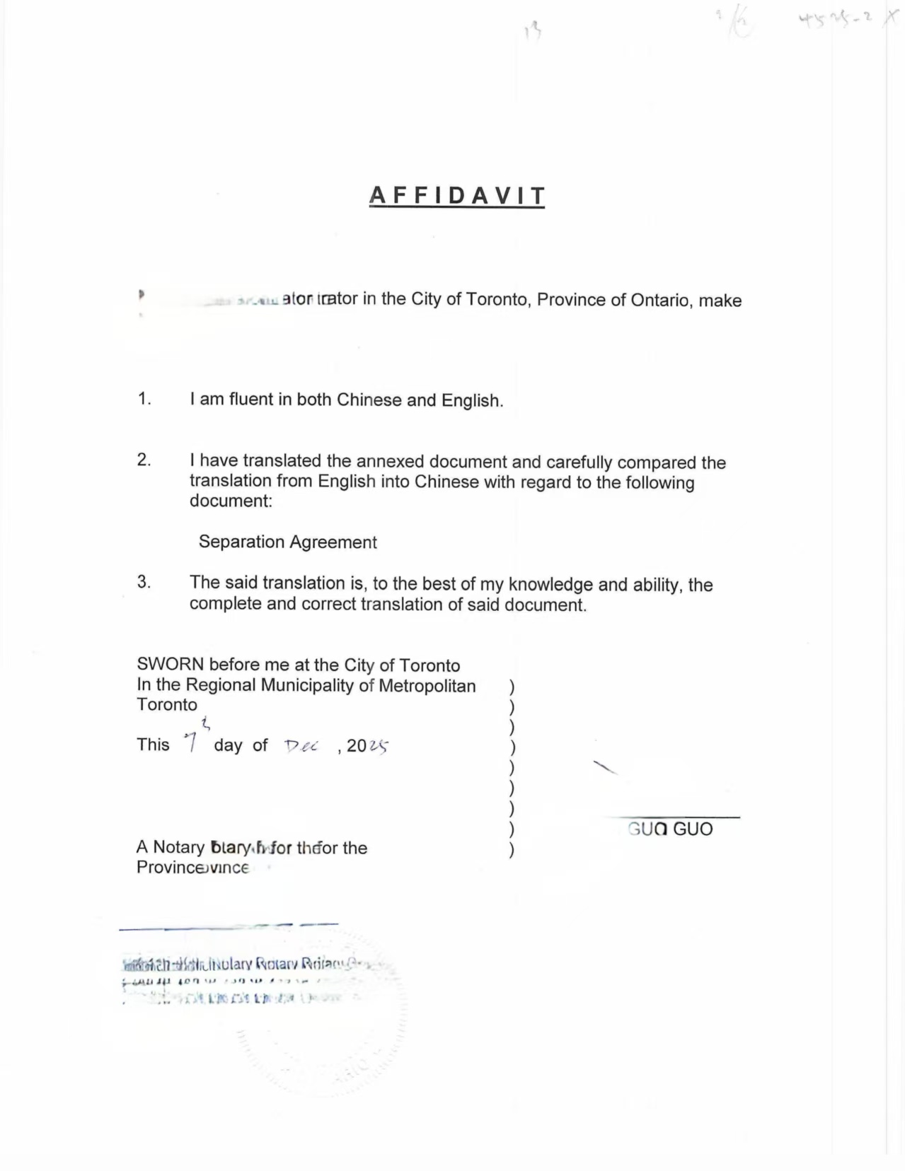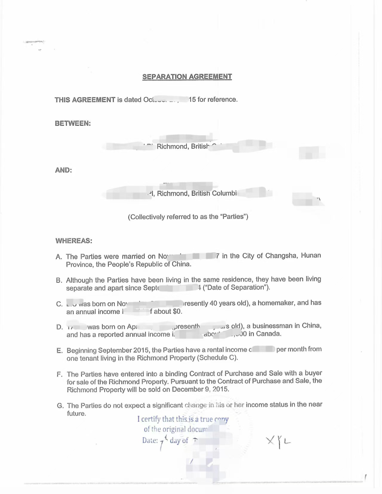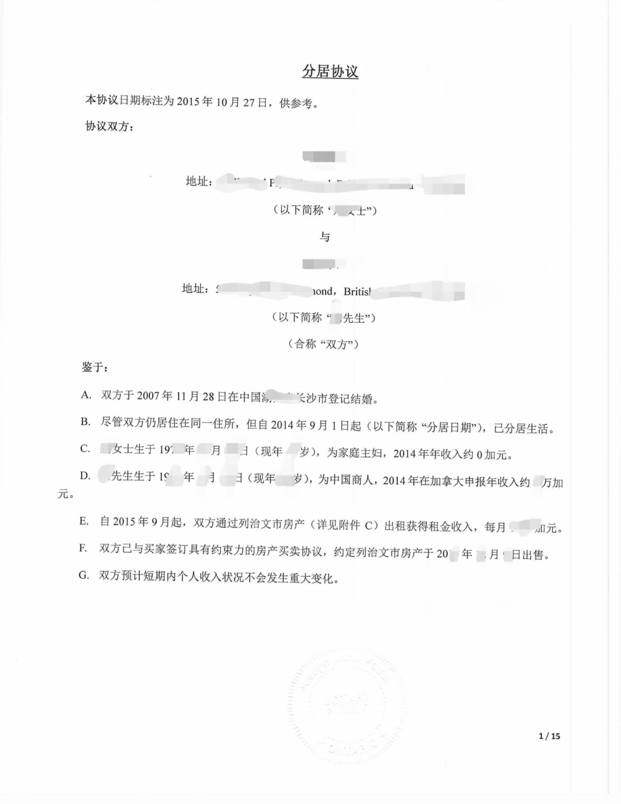 当事人 林芊羽(化名) 与前配偶 邵亦恒(化名) 多年前在加拿大正式签署了一份分居协议(Separation Agreement),内容超过十几页,涵盖: