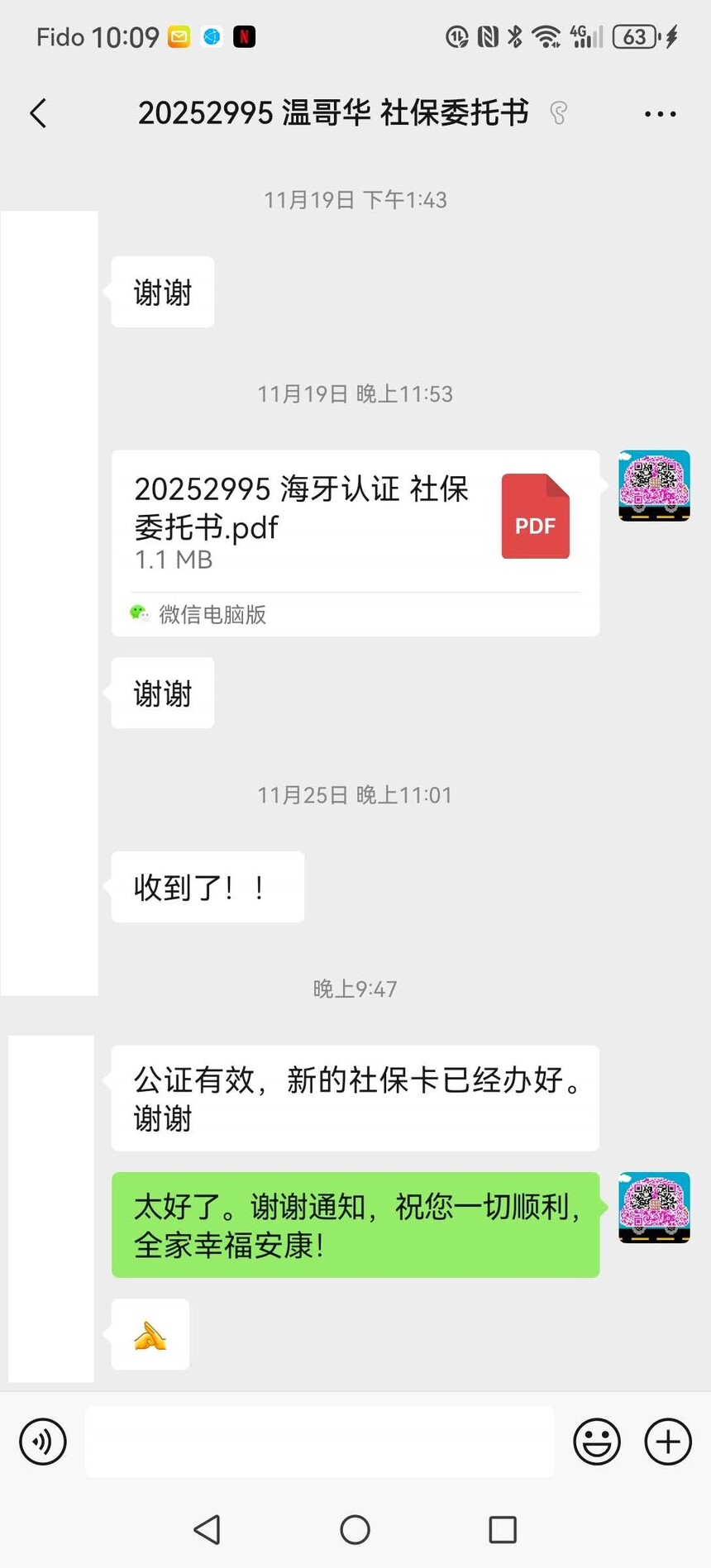第三天上午,认证文件出件,我第一时间发给她电子 PDF,并安排邮寄给她妹妹。