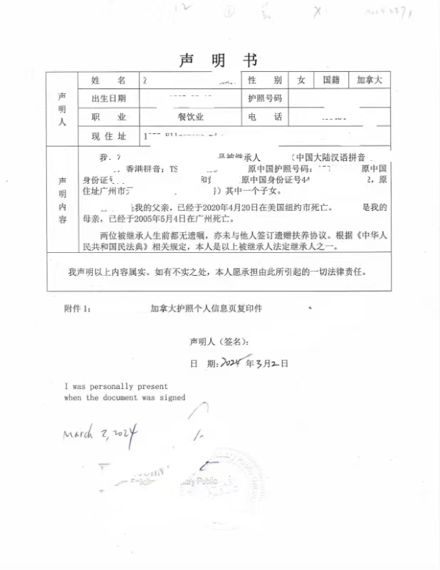 由于陈女士无法回国办理相关证明,也不便亲自往返美国当地多个部门,遂通过专业渠道在美国境内完成《亲属关系声明书》的公证及海牙认证事宜。该声明书详细载明了声明人的身份信息、国籍情况、与被继承人的亲属关系、被继承人去世时间及是否存在其他继承人等关键事实内容,文件形式及表述均符合中国公证处及不动产登记部门在继承业务中的审查要求。