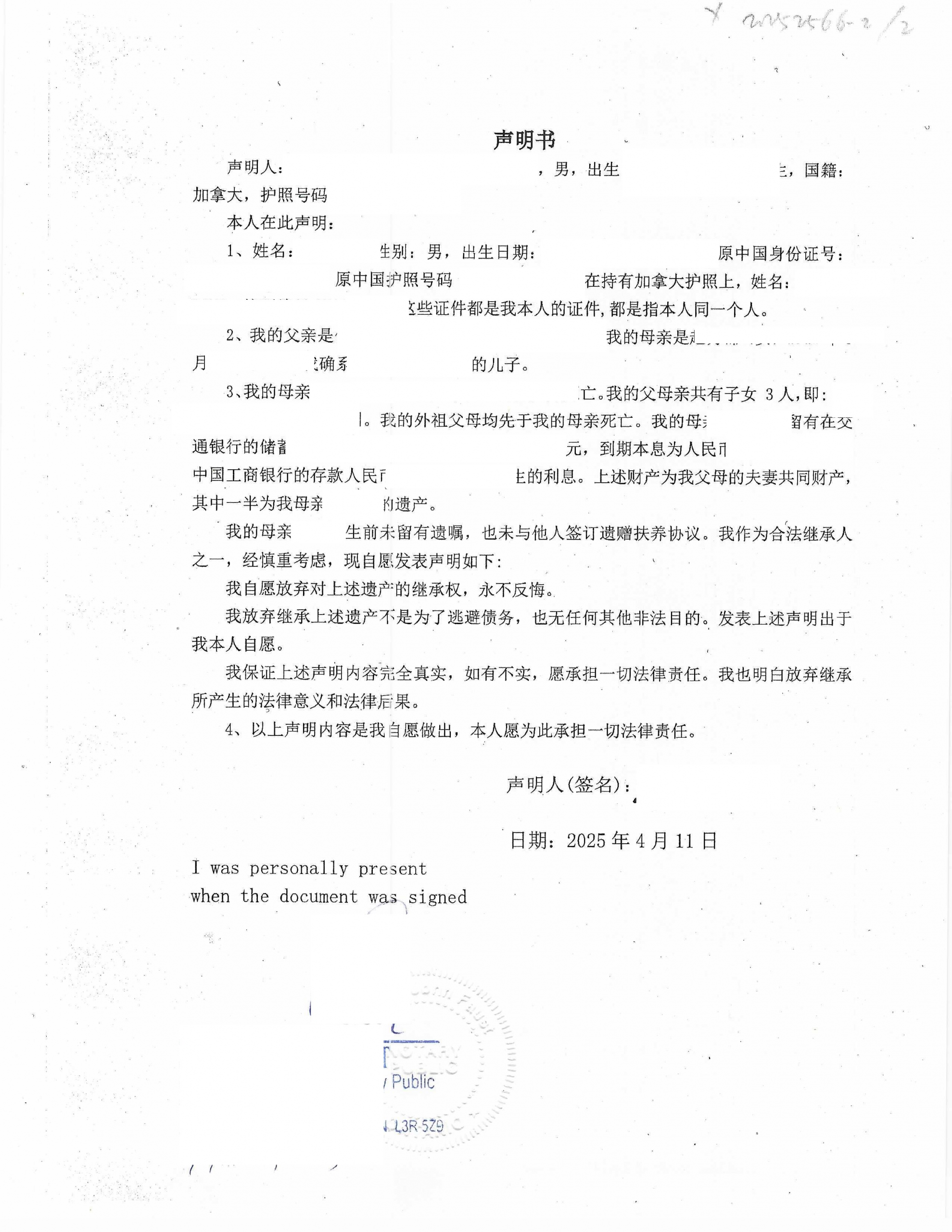 邓先生(化名)现居住于美国佐治亚州亚特兰大,已取得加拿大国籍,长期在北美生活。因其母亲生前在中国境内留有银行存款等遗产,依法应由法定继承人共同参与继承程序。经家庭成员协商一致,邓先生基于个人意愿,决定依法放弃其在该笔遗产中的继承权,以便其他继承人顺利推进中国境内的遗产继承手续。