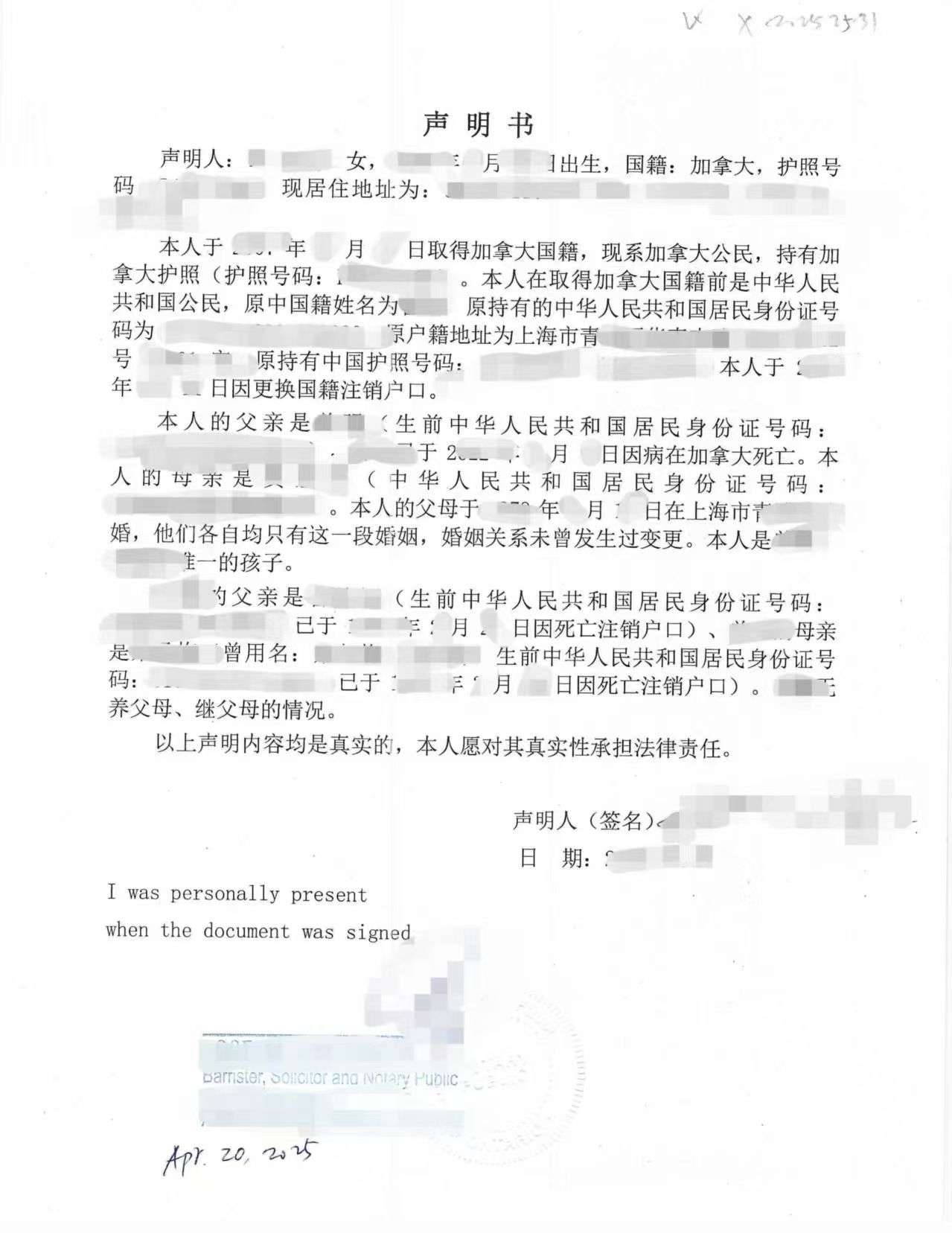 该声明书内容较为复杂,不仅涉及声明人自身的身份变更情况,还需对其原中国籍身份、父母的婚姻关系、家庭成员构成、是否存在再婚、收养、继子女等情形作出完整、连续的说明。文件中同时载明被继承人生前的基本身份信息、死亡时间及地点,并明确声明人与被继承人之间的法定亲属关系,以满足中国继承公证中对“继承人范围清晰、继承关系明确”的审查要求。