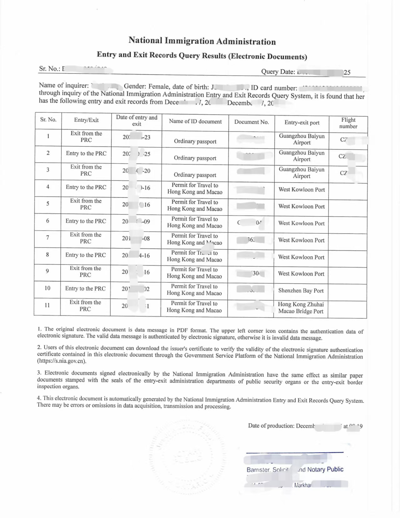 中国国家移民管理局出入境记录查询结果翻译公证加拿大用——案例分享